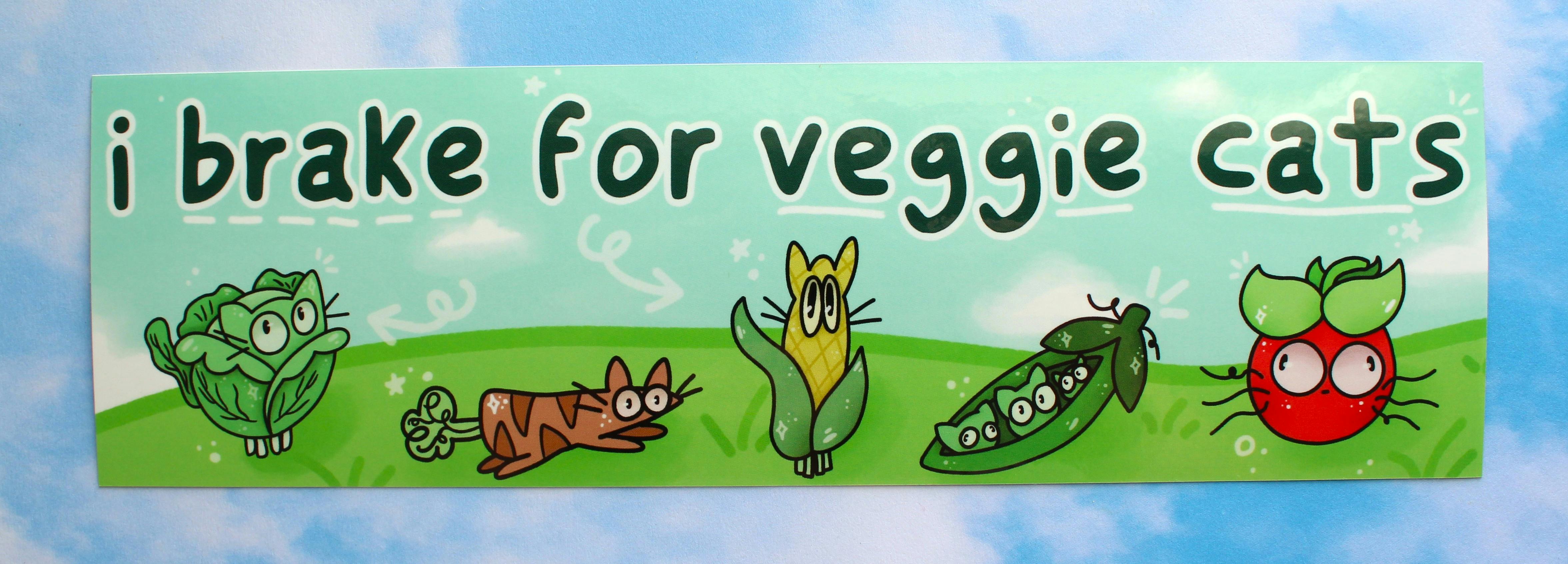 Tell everyone how you will brake for Veggie Cats with this cute weatherproof Bumper Sticker!! Stickers measure 10"x 3".