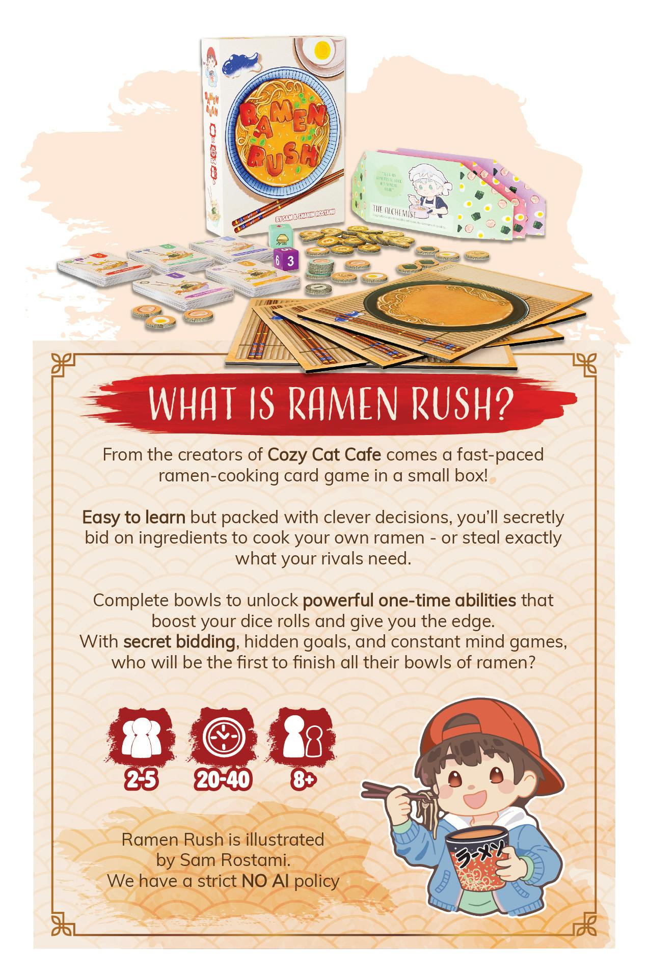 This easy-to-learn card game has you bidding on ingredients to be the first to cook a bowl of ramen. Will you focus on collecting ingredients for high-scoring bowls, or will you try to block your opponents from cooking theirs first?