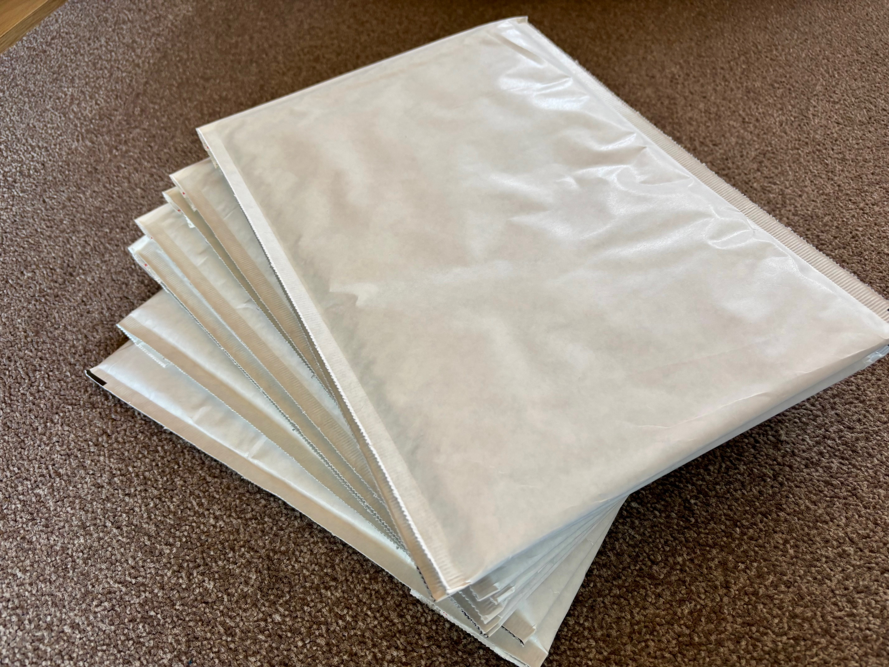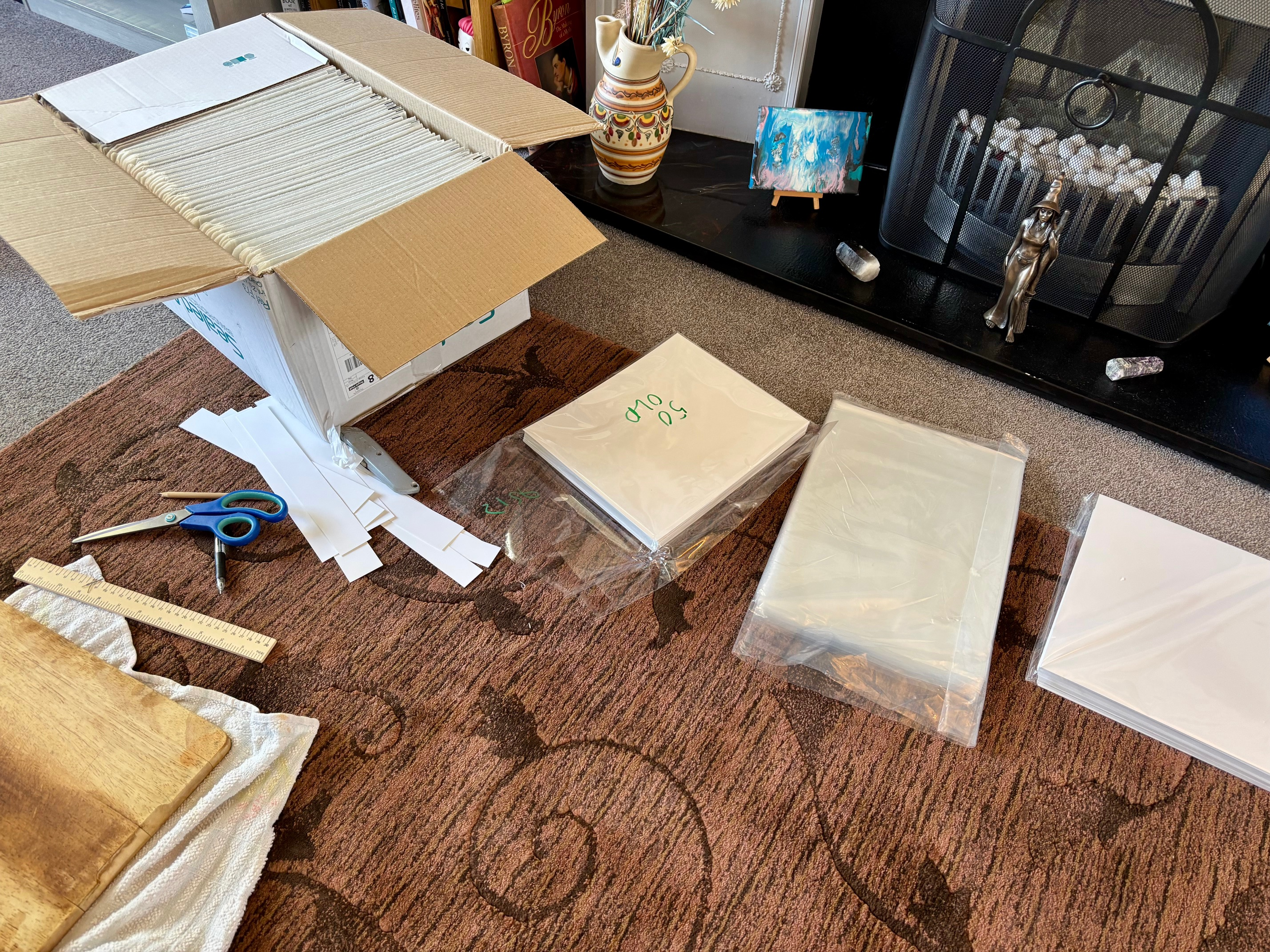 I've got a little production line going on my living room floor, putting each bundle together, sealing it in a sleeve with a card back, and sticking it in a padded envelope. Here's a peek: