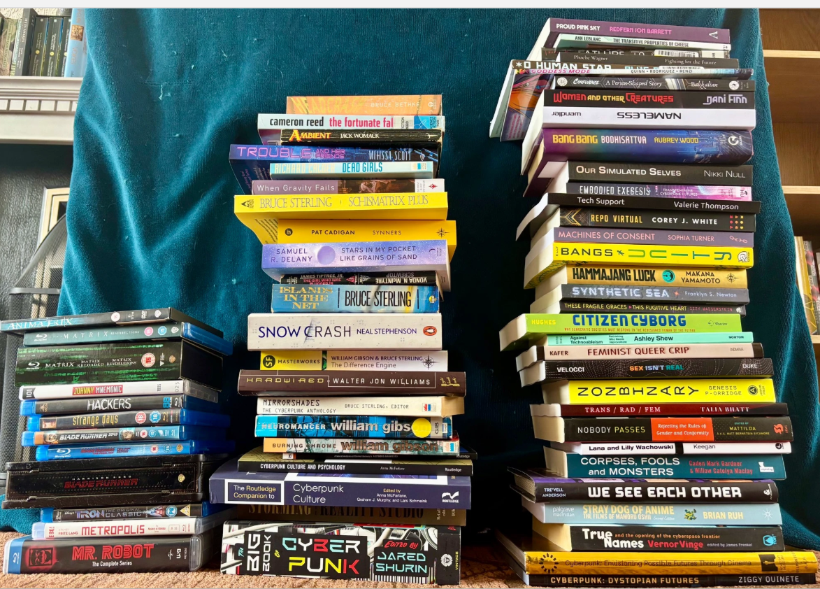 The reading, research, and writing for chapter one is well underway. It's all about the origins of cyberpunk and exploring depictions of transness, trans+ bodies, and gender diversity in classic cyberpunk media. And, would you believe, I've already found so *so* much transphobia.