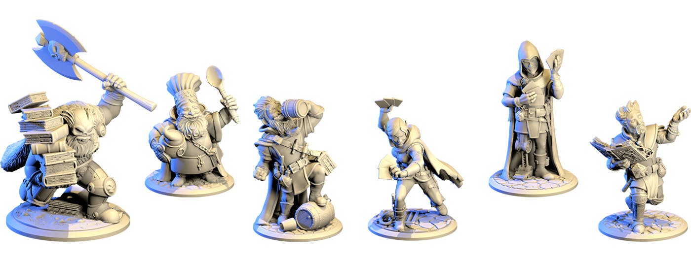 These are high-quality, cast tabletop miniature kits (assembly required) featuring characters from Intoximancy, Death Dealing, Nibblemancy, and The Prayer's Handbook: The Meta Domain Cleric.