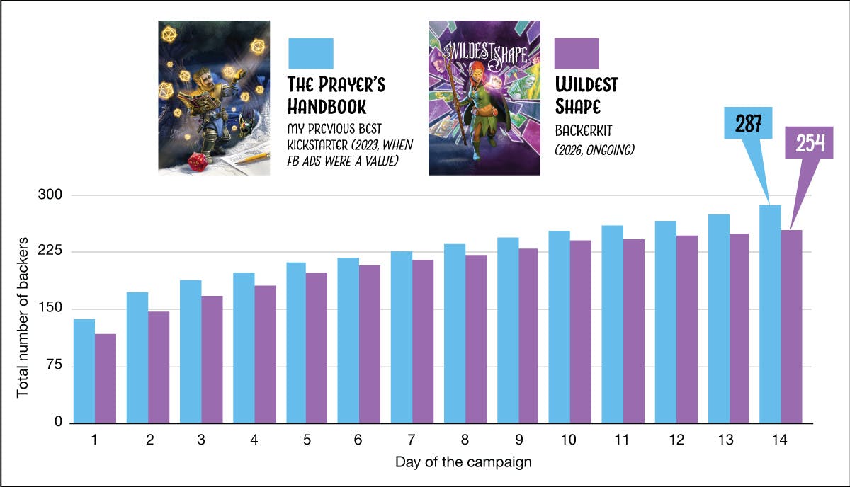 Because I love charts and data, here’s how Wildest Shape is doing compared with my most popular previous crowdfunder, The Prayer’s Handbook…