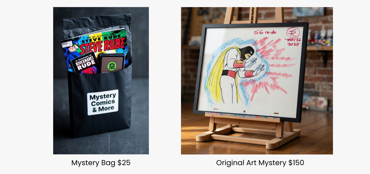 Want to stay connected year-round? For $5/month on Patreon, you get access to Steve’s archives, hi-res scans of rare and unpublished art, monthly wallpapers, Saturday livestream references, and a seat in the Rude Dude Discord. It’s the studio, minus the commute. patreon.com/steverude