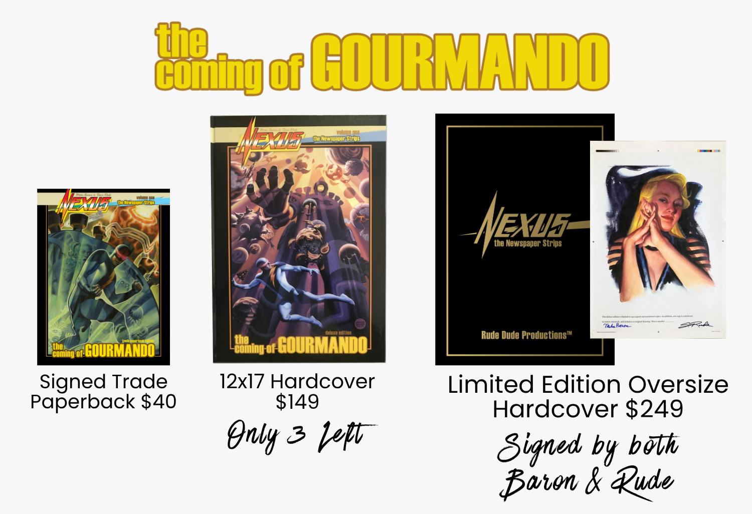Gourmando Limited Edition Oversized Hardcover (12x17 in / 30.5x43.2 cm) (2021) - $249 Edition of 250 with slipcase, hand-numbered. Signature plate permanently bound into the book, double-signed by Steve Rude and Mike Baron. Shrink wrapped. 70 copies remaining from the original print run. This is not a campaign reprint. These are the real ones.