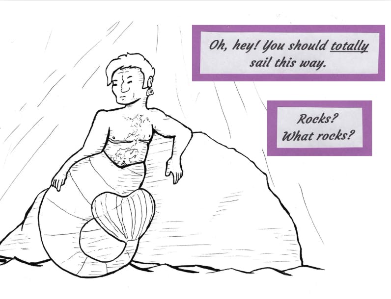 Drawing of a trans merman on a rock in the sea, calling out to passing ships.