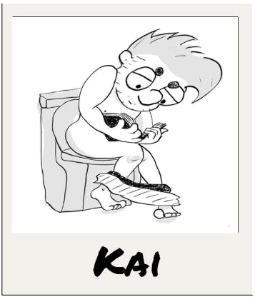 Polaroid picture frame with a cartoon drawing of Kai sitting on a toilet reading.
