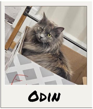 Polaroid picture frame with a picture of a muted tortoiseshell cat sitting inside a box.