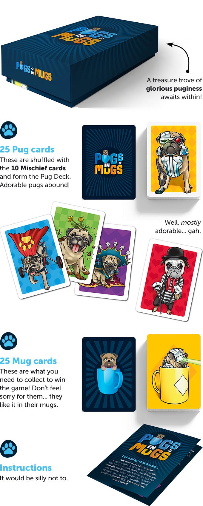 Pugs in Mugs is a family-friendly set collection card game about collecting pugs, for 2 – 5 players!