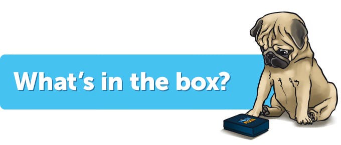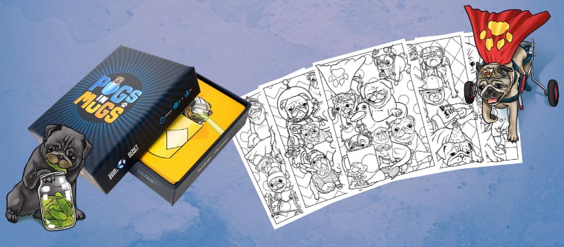 A single copy of Pugs in Mugs, a set-collection card game for 2-5 players, and a printable PDF containing 5 unique colouring in pages hosting Pugs from the card game!