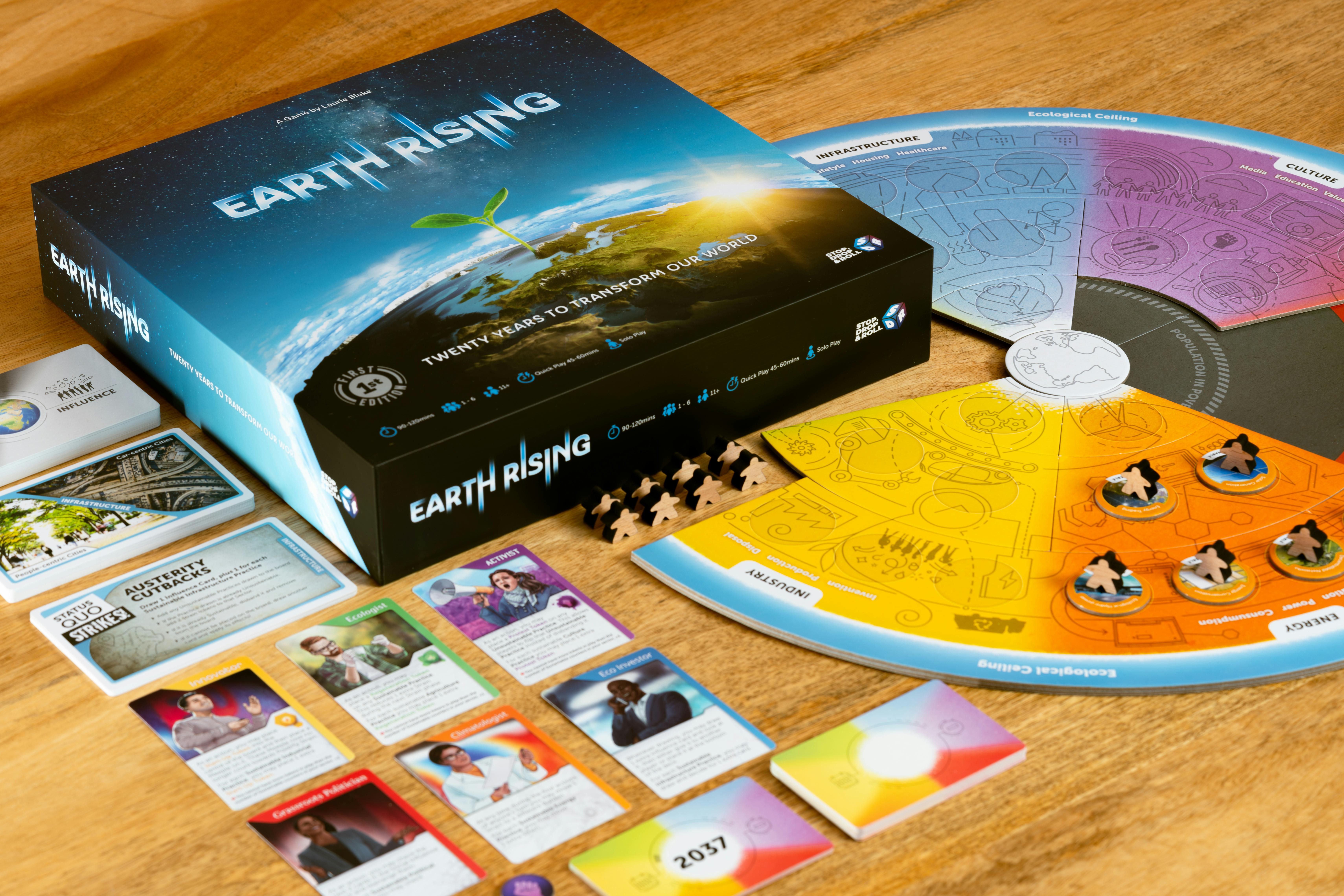 Laurie delved deep into designing Earth Rising as a hopeful game, a game where players take back control of our failing and unsustainable systems and work together to create ecological harmony. Based on the Doughnut Economics system by Kate Raworth,