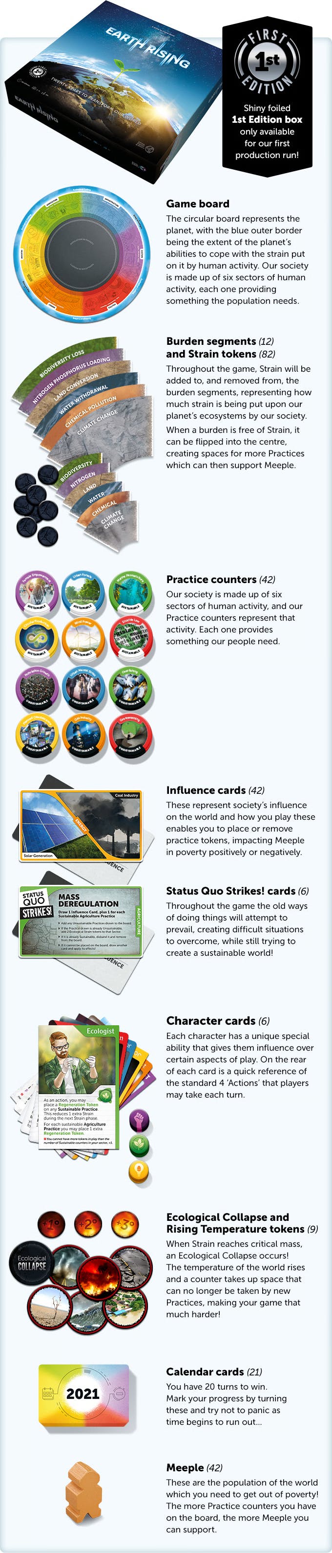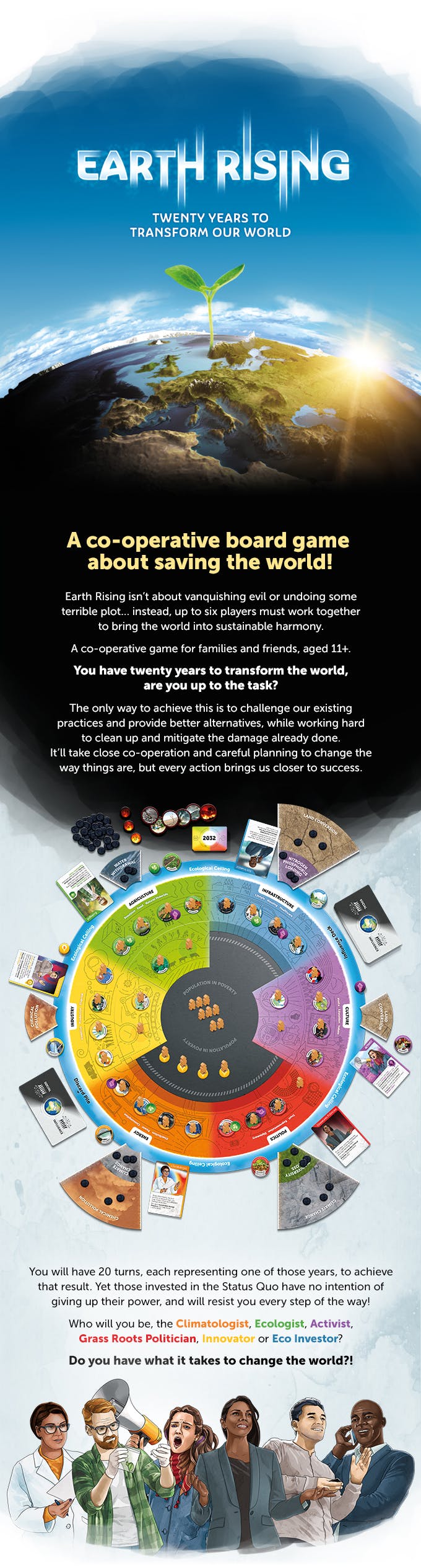 A single copy of the board game Earth Rising: 20 Years to Transform Our World. A cooperative board game about saving the world for 1-6 players!