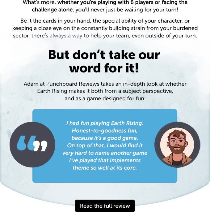 Earth Rising isn't about vanquishing evil or undoing some terrible plot... Instead it's about working together to achieve sustainable harmony. The only way to achieve this is to challenge existing practices and provide better alternatives, while working hard to clean up and mitigate the damage already done. It'll take close cooperation and careful planning to change the way things are, but every action brings us closer to success.