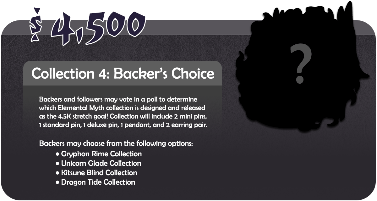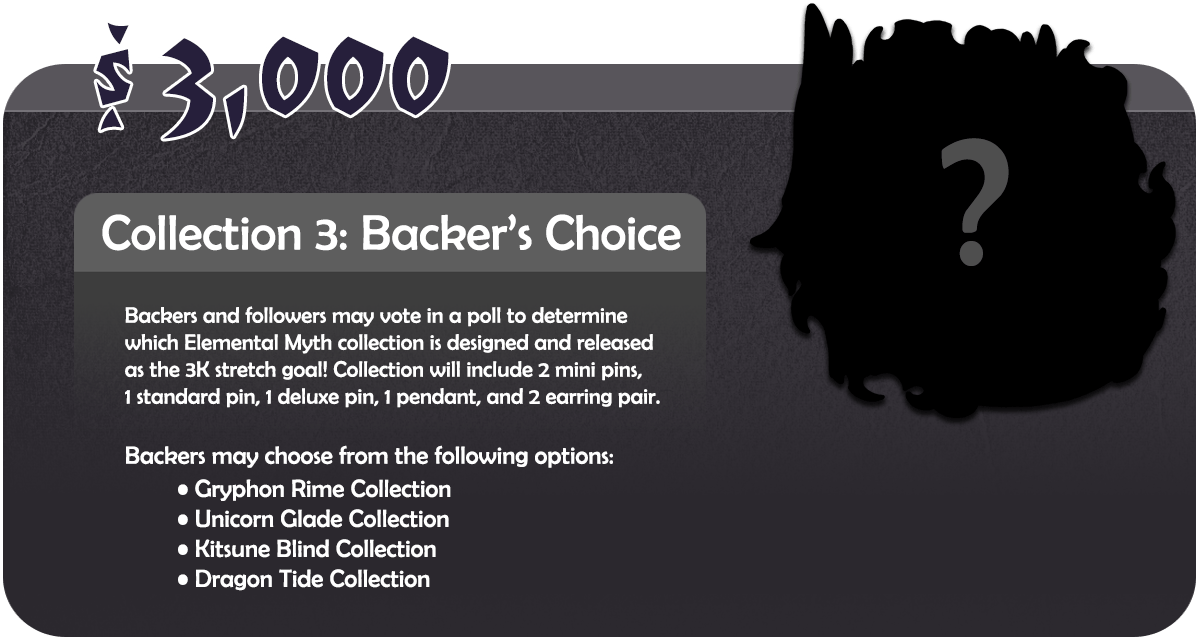 Thanks to your amazing support, we’ve received the Stretch Goal funding needed to produce two additional collections beyond the Wyvern Wind and Phoenix Fire pins. I have several themes I’m enthused about, and backers get to choose which two will move forward. Potential themes include Gryphon Rime, Dragon Tide, Kitsune Blind, and Unicorn Glade.