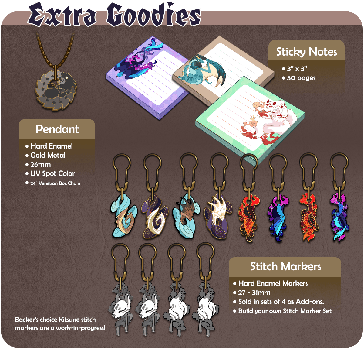 A few extra items made their way onto the page since the campaign launched. Sticky notes, a pendant version of the ouroboros pin*, and stitch markers are now available.