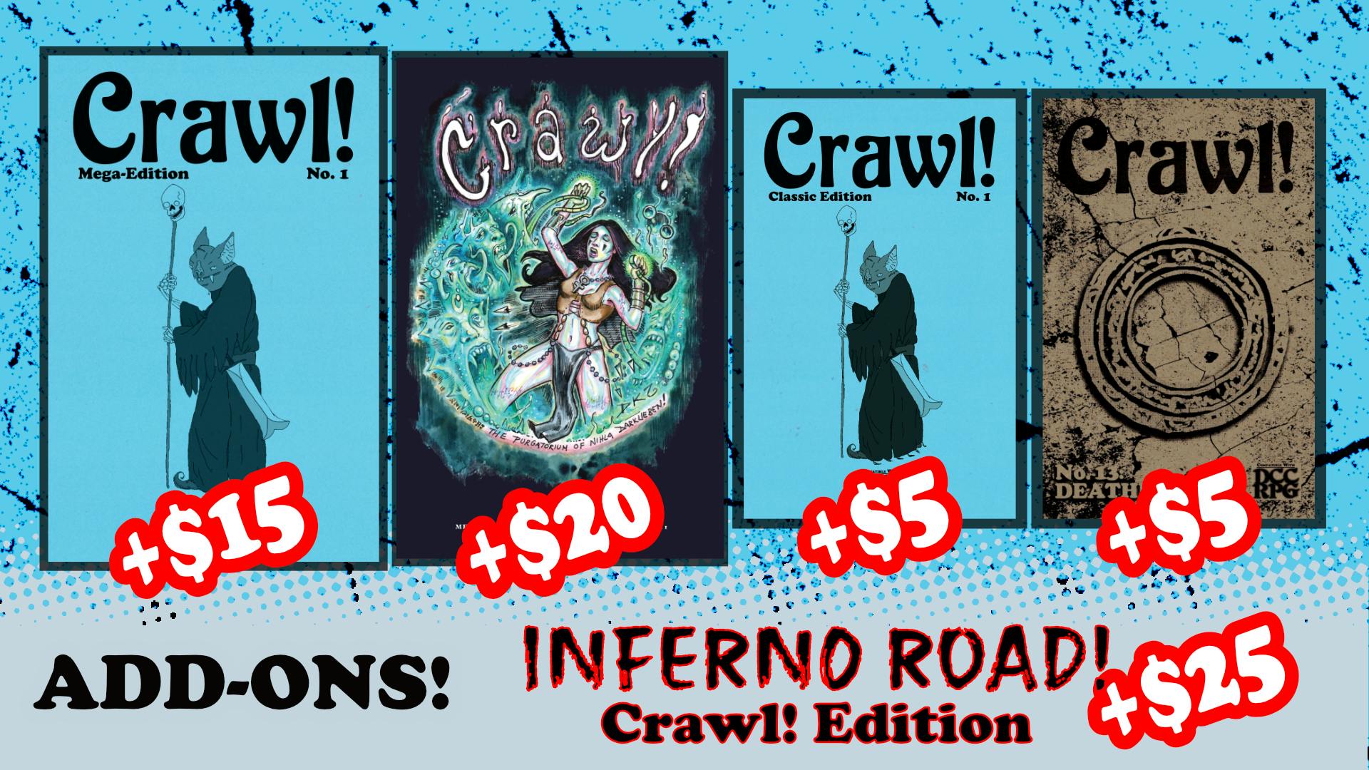 We're trying to keep it simple. You can order extra copies of both covers of the Mega-Editions and copies of the classic zine. In addition to those, you can also have access to the current edition of Crawl! fanzine no.13: DEATHMATCH! (My favorite) AND a new Crawl! Edition of Inferno Road courtesy of Doug Kovacs, Wayne Snyder, and Space Penguin Ink.