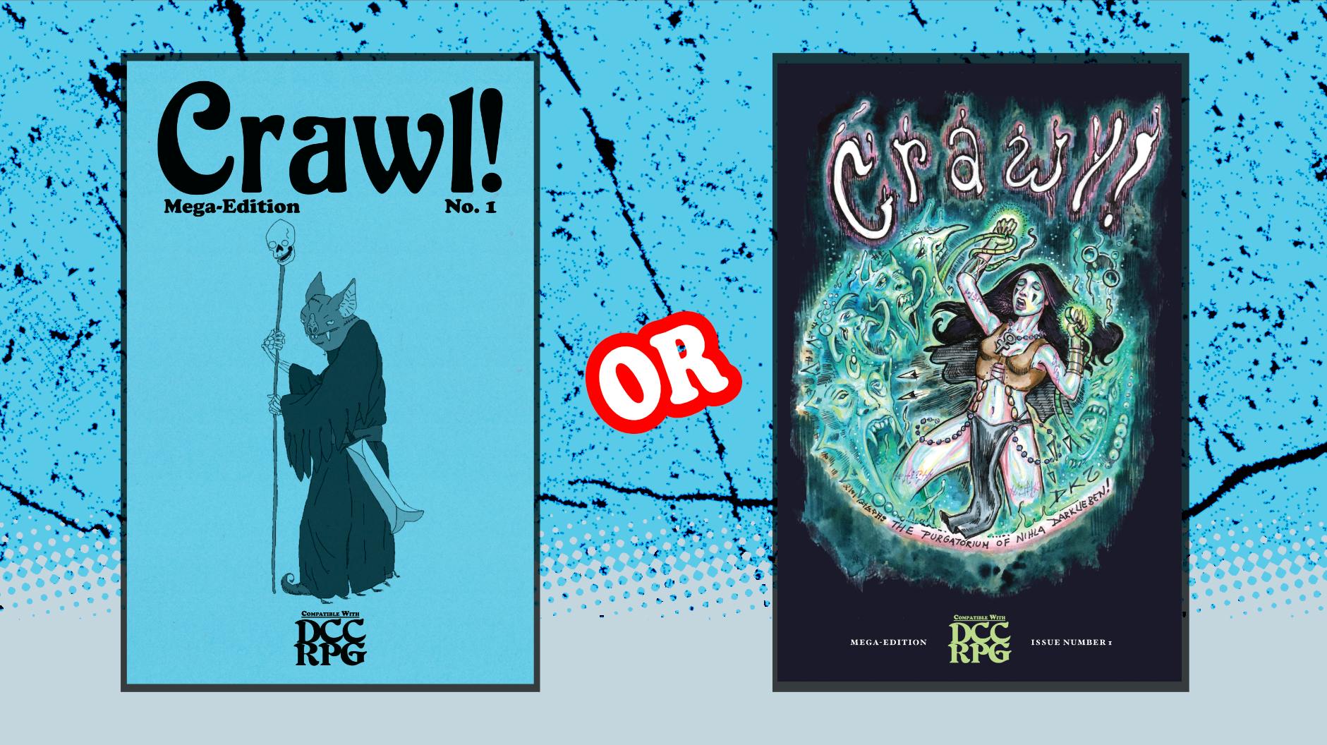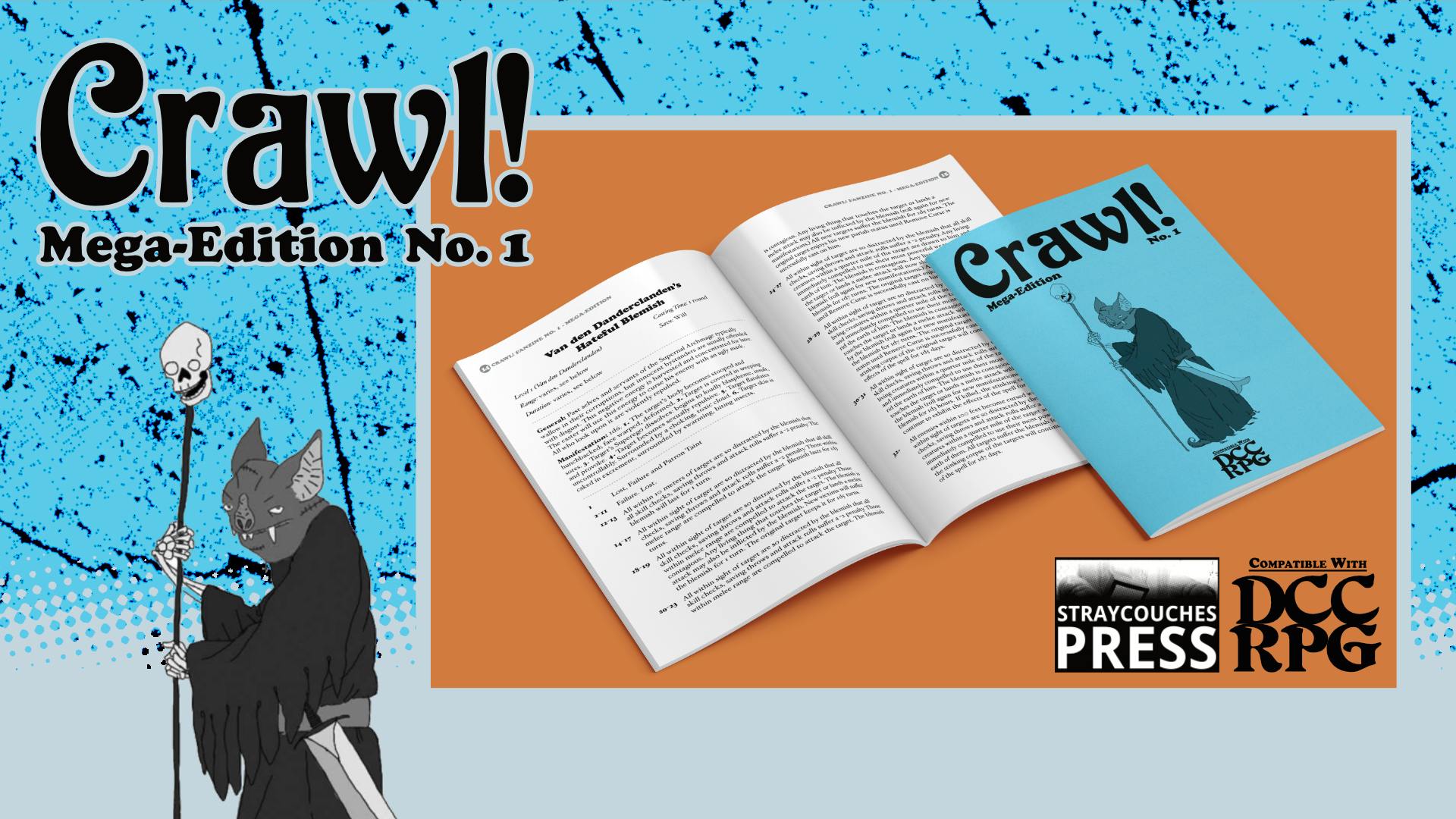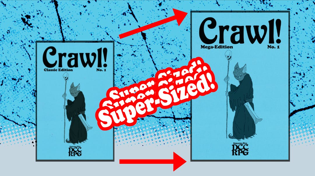 Crawl!, if you aren't familiar, is the original zine compatible with DCC RPG. It was first published in 2012, and it has been evergreen in the classic and simple, copy-shop printed, stapled and folded zine. But instead, this version will be in a super-sized format and printed on higher-quality paper — the Mega-Edition!