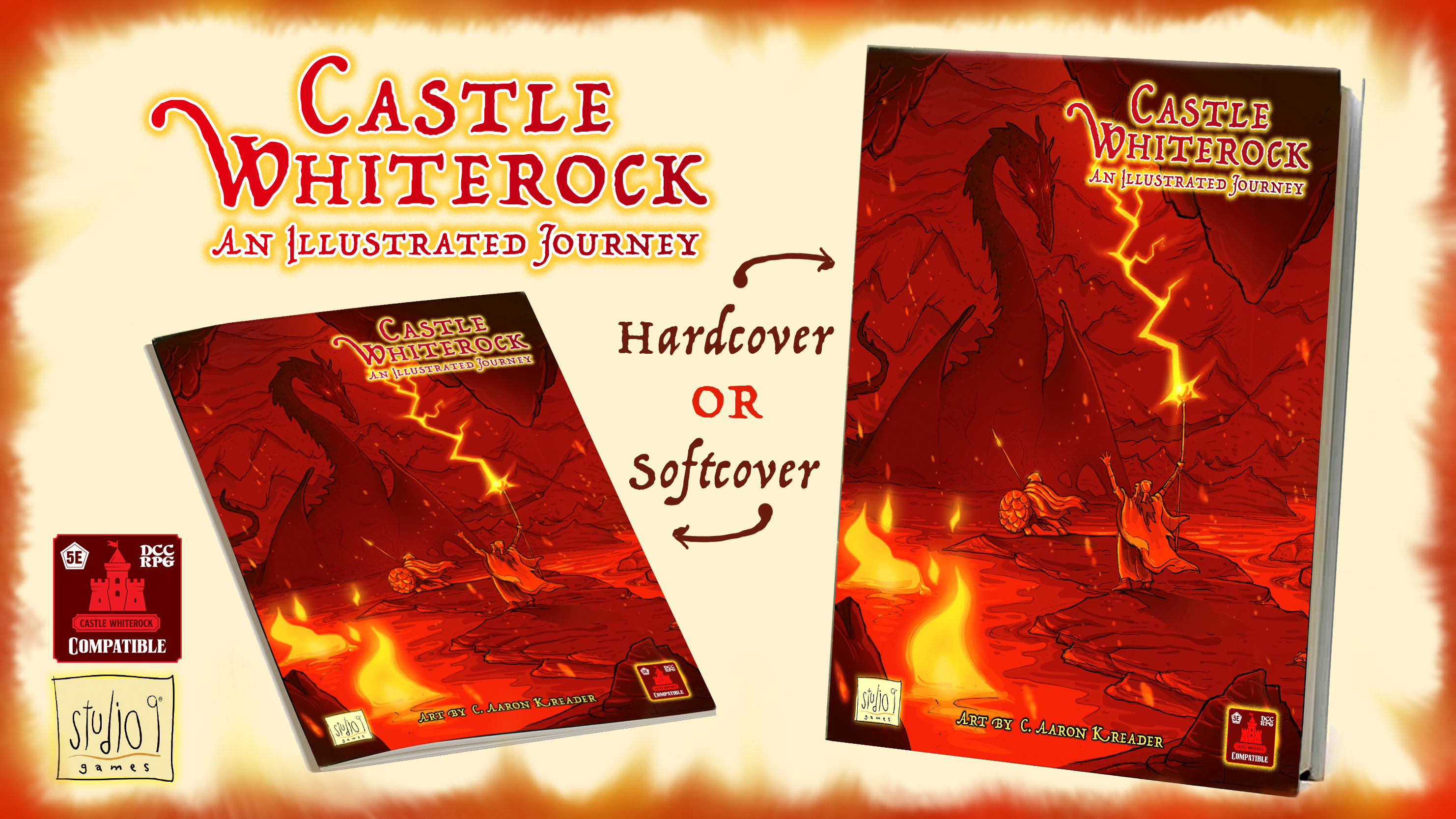 We will also roll out a special hardbound edition of our compiled Studio 9 Games adventures, a new Castle Whiterock level, as well as an Illustrated Journey through Castle Whiterock. This special offering is part of our sister rollout for mega dungeon month. Check it out here.