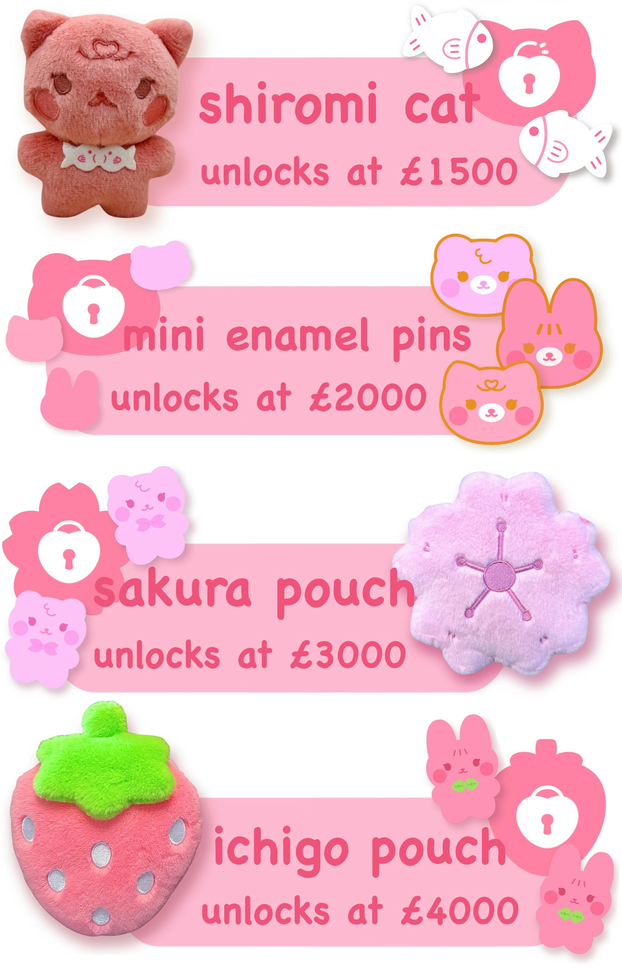 The plush pouch goals are now cheaper and the enamel pins have been moved to be unlocked a lot sooner!