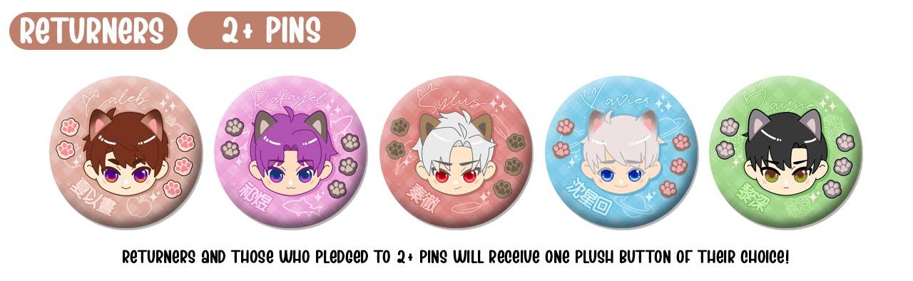 All the pins will be made as hard enamel with gold metal plating. In addition, we'll be using screen printing and gradient printing on the details such as the eyes, ears, and cheeks.