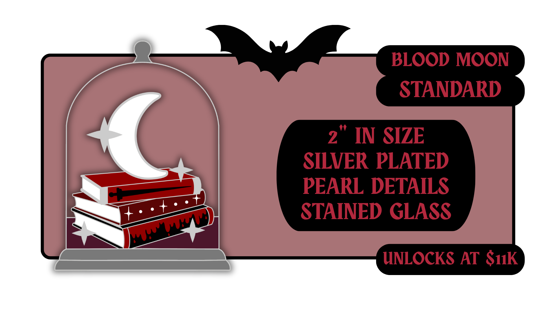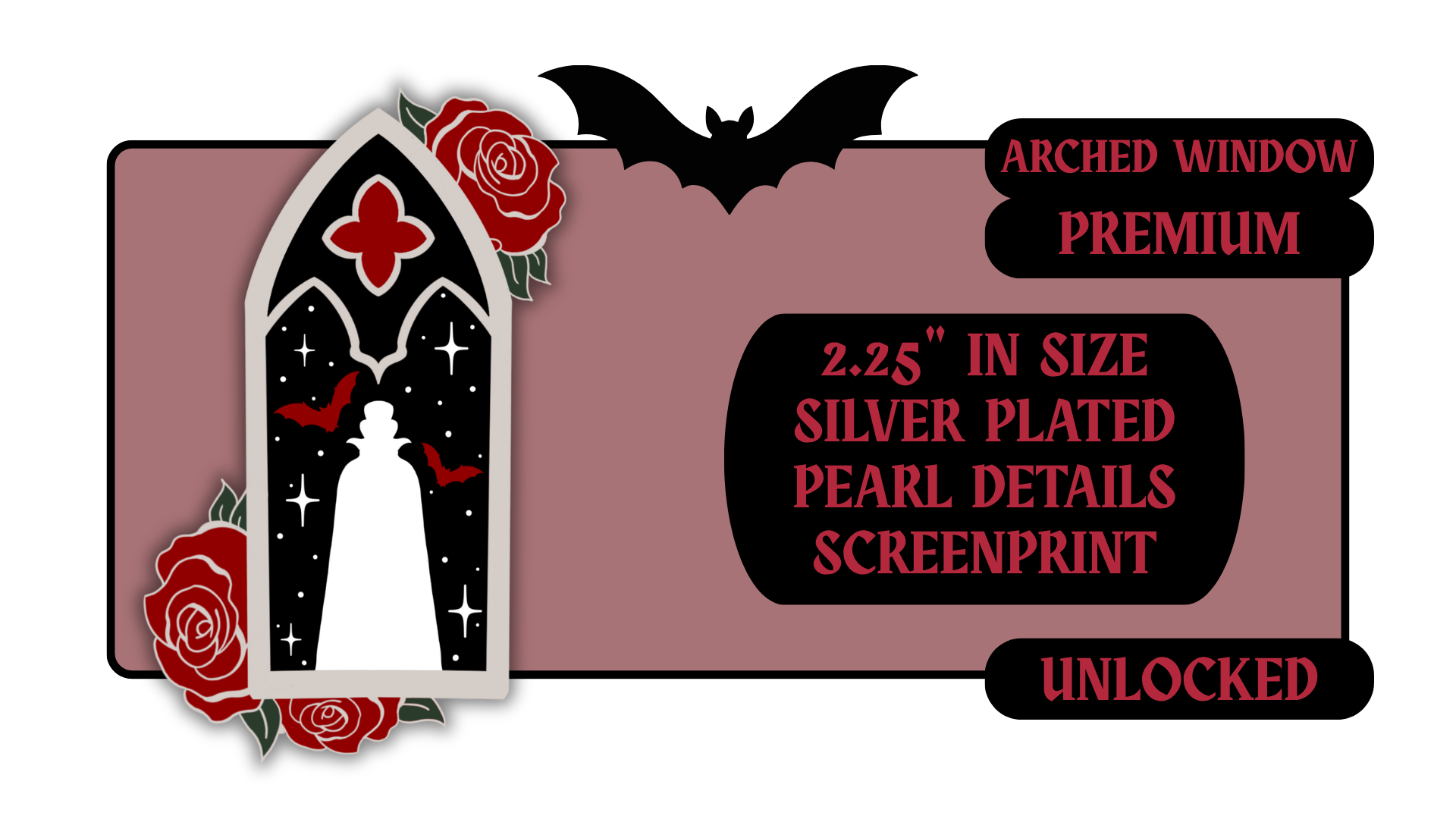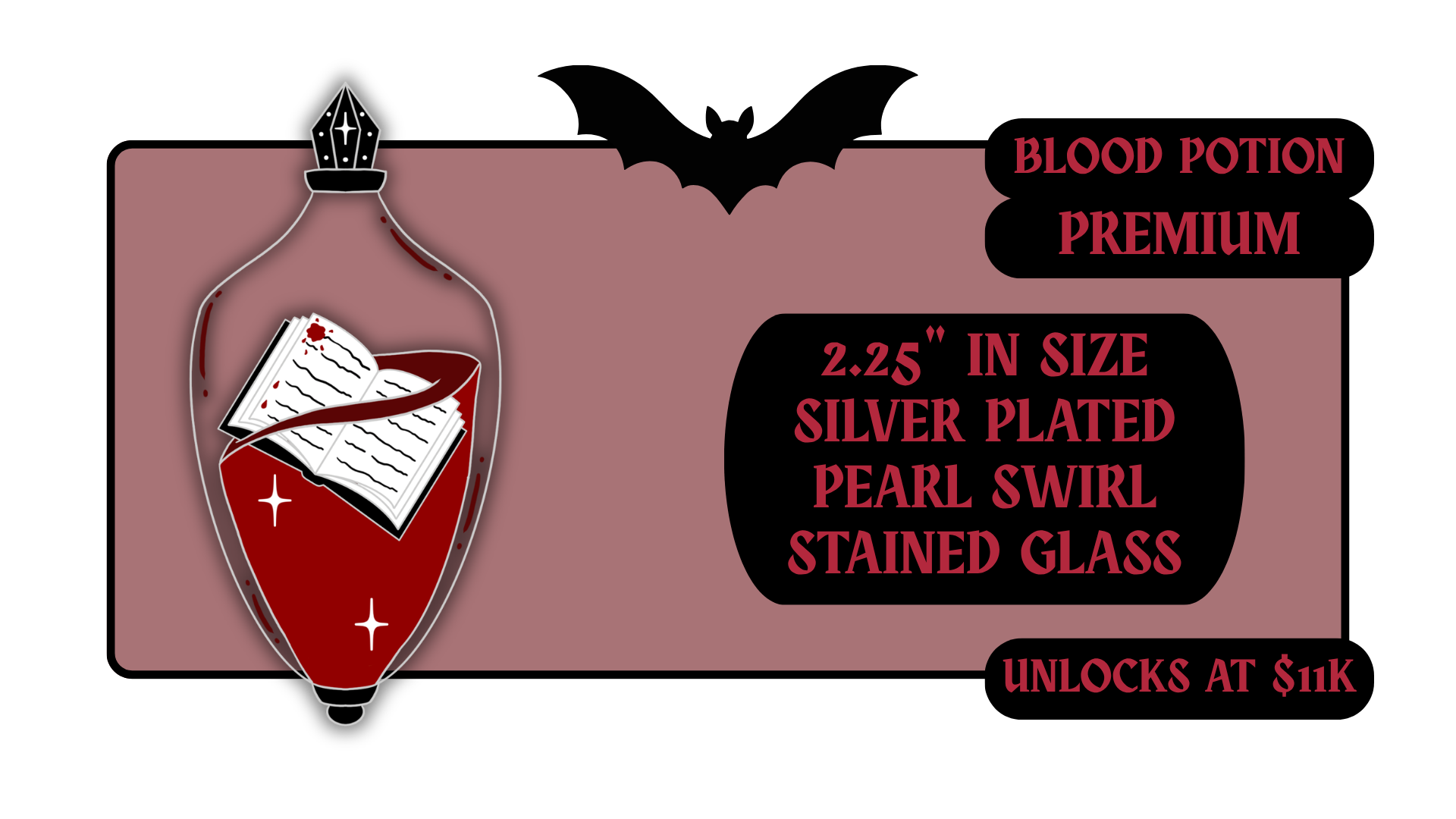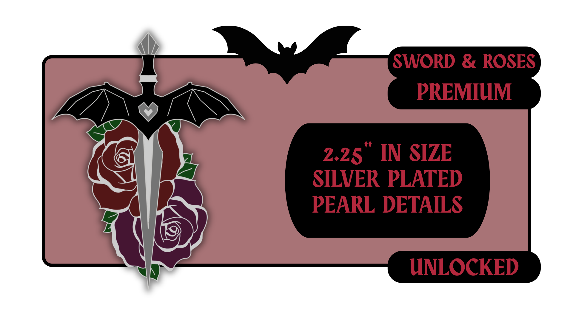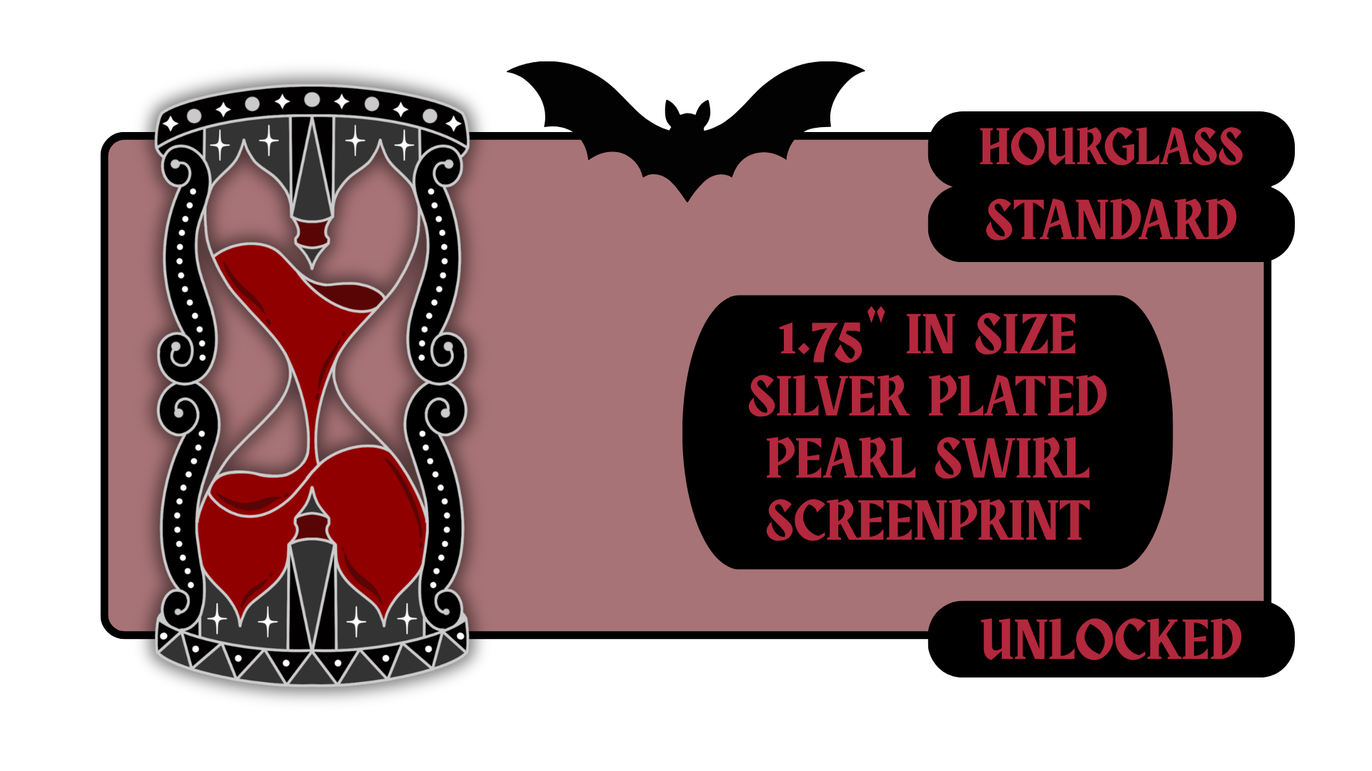 Standard Pins: between 1.5" to 1.75" in size with effects like pearl swirl, pearl enamel or glitter. Premium Pins: between 1.75" to 2.25" in size with more complicated effects like clear stained glass or 3D molded metal.