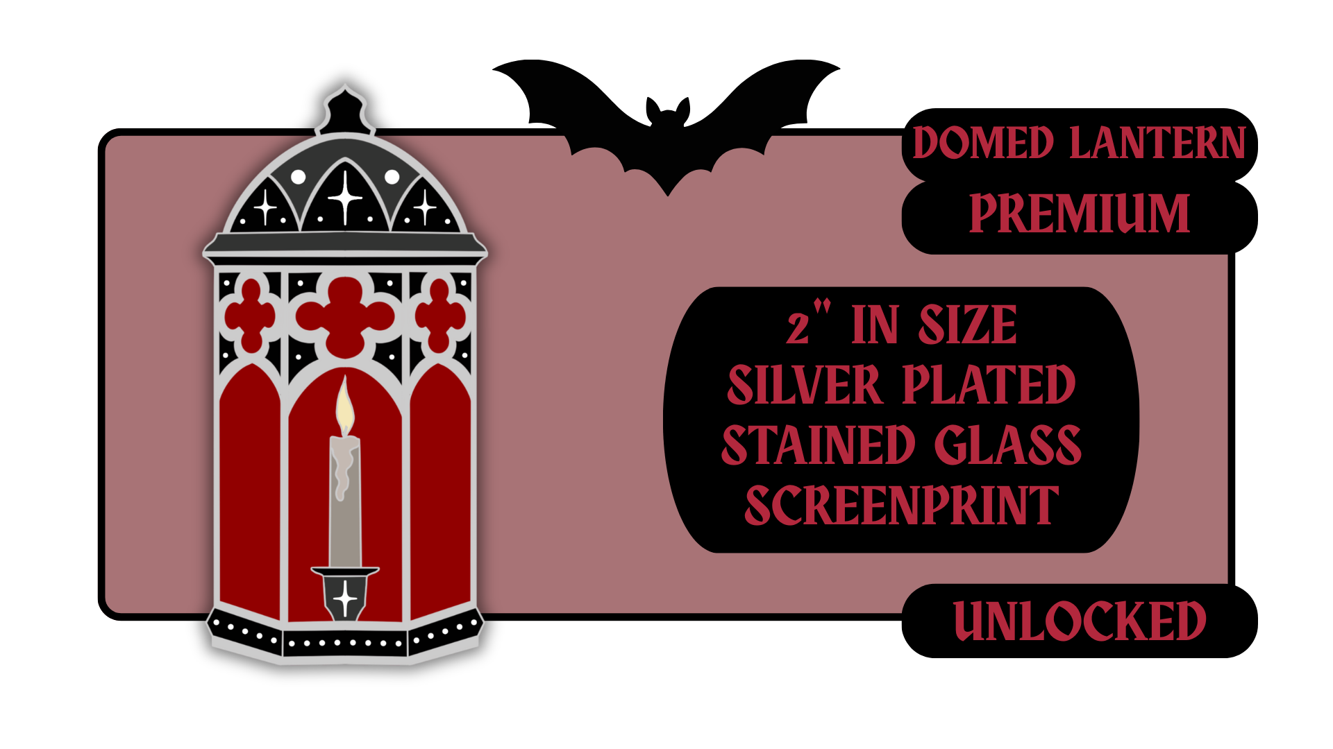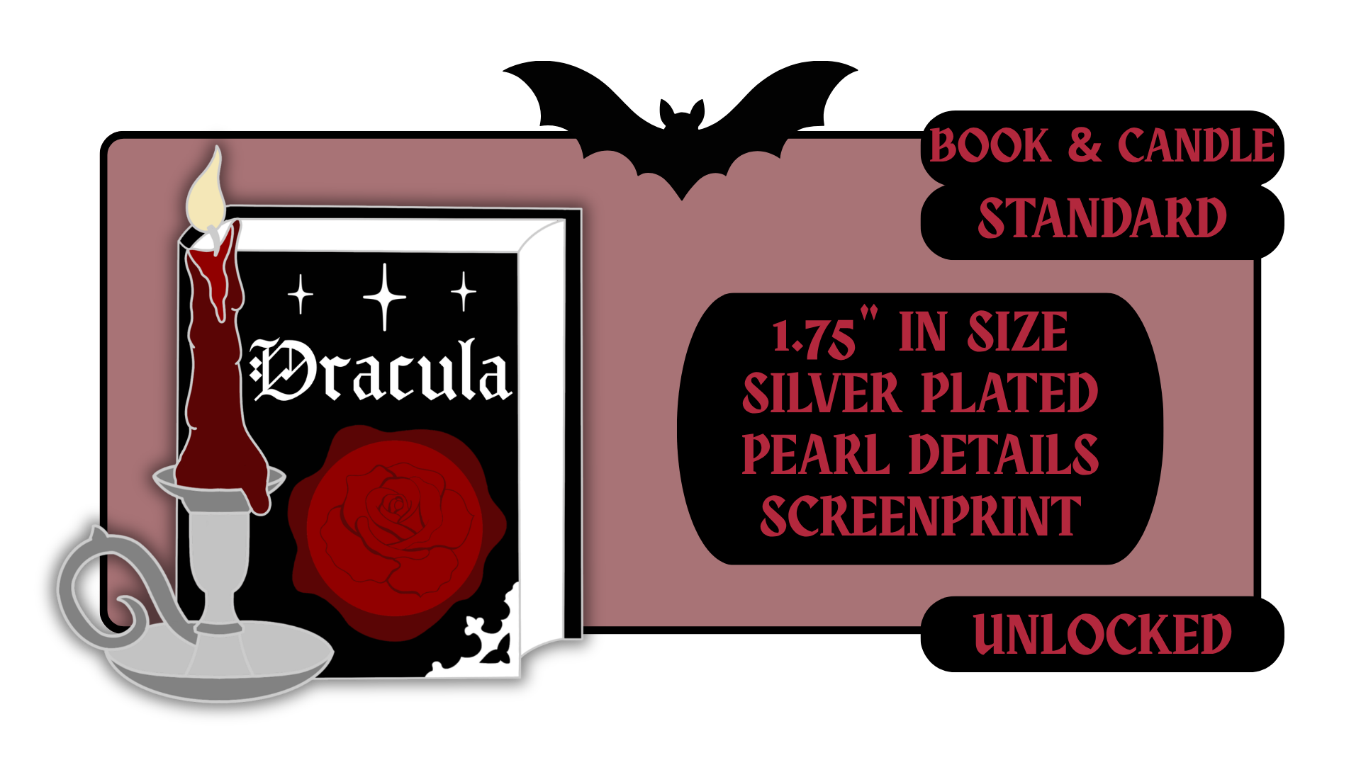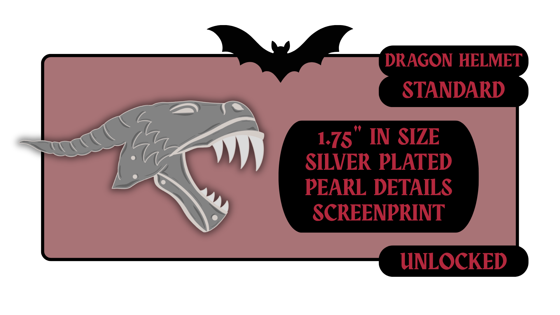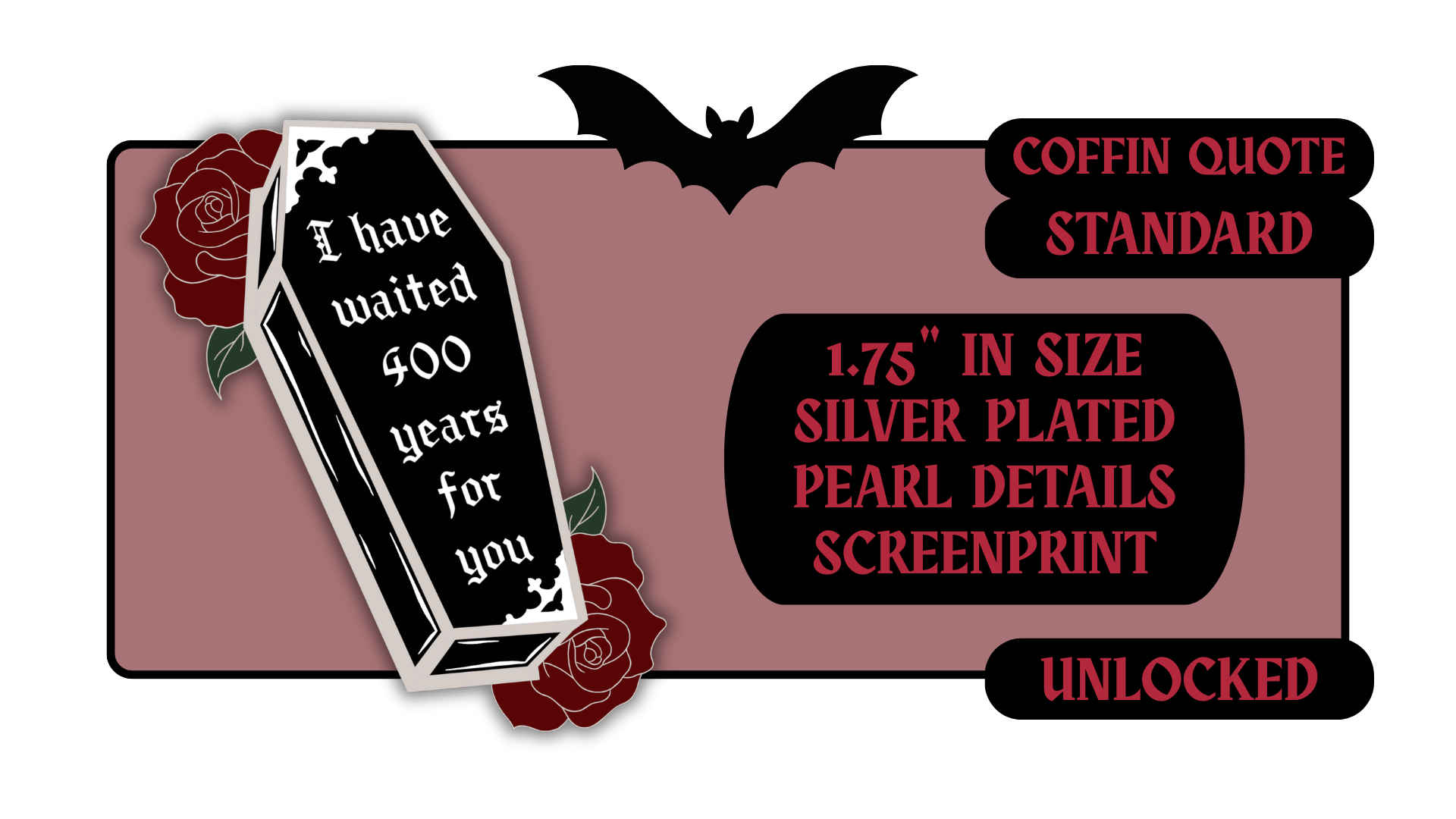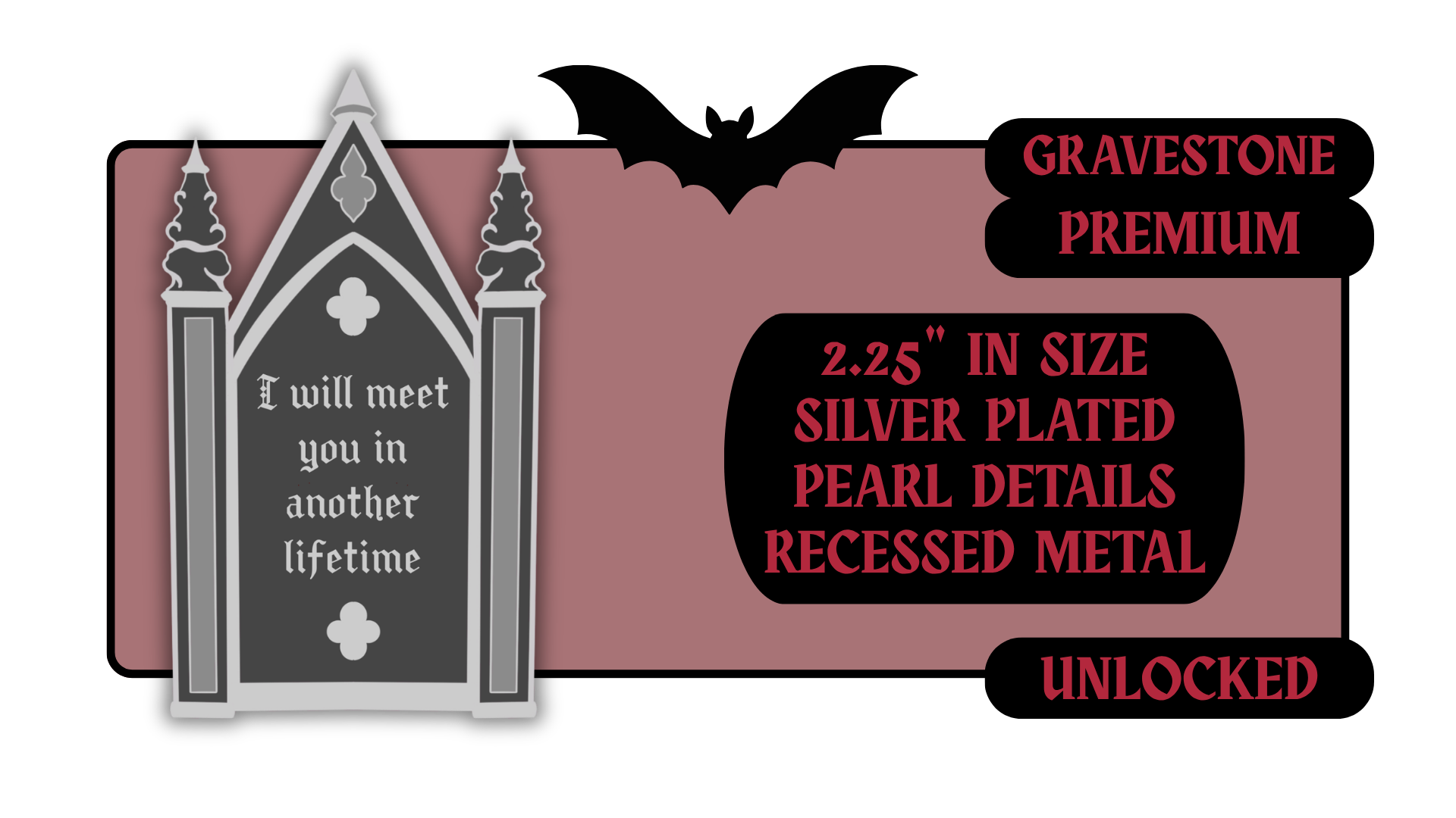 Standard Pins: between 1.5" to 1.75" in size with effects like pearl swirl, pearl enamel or glitter. Premium Pins: between 1.75" to 2.25" in size with more complicated effects like clear stained glass or 3D molded metal.