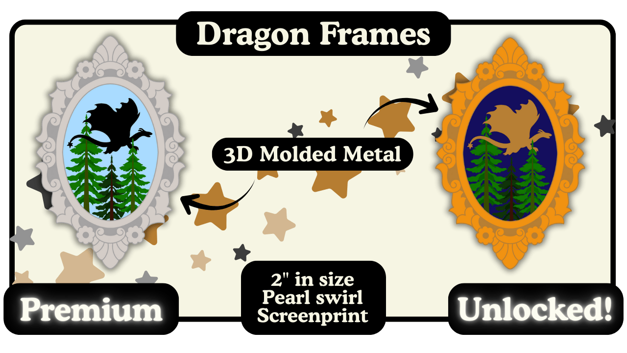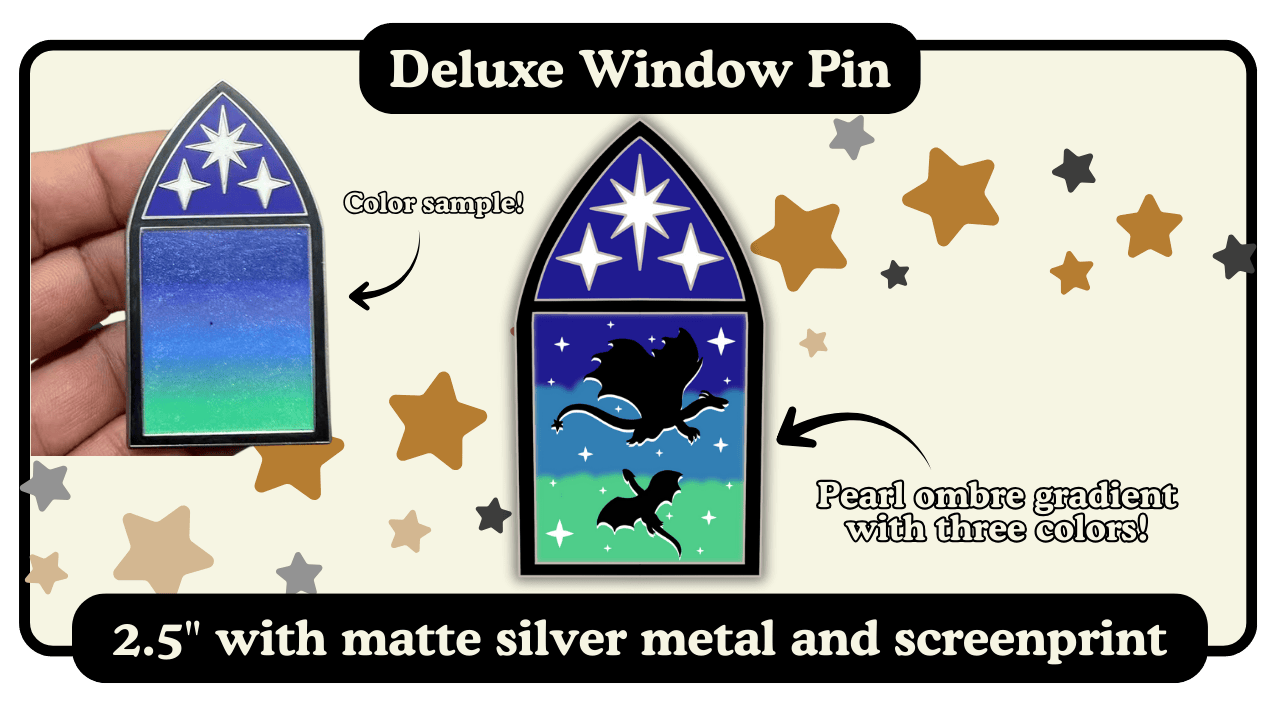 Standard Pins: between 1.5" to 1.75" in size with effects like pearl swirl, pearl enamel or glitter. Premium Pins: between 1.75" to 2" in size with more complicated effects like clear stained glass or 3D molded metal.