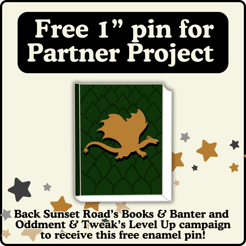 We are partnering with our friends at Oddment & Tweak for their Level Up! campaign; by backing both projects you'll receive a free pin from both campaigns. My freebie is another 1" book cover pin. Check it out!