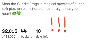 We're off to a great start already, and itโs all thanks to this amazing community! We are already 20% of the way to bringing these Plushphibians to life. Letโs keep the momentum going โ please share the project with any fellow frog lovers in your life! ๐ธ