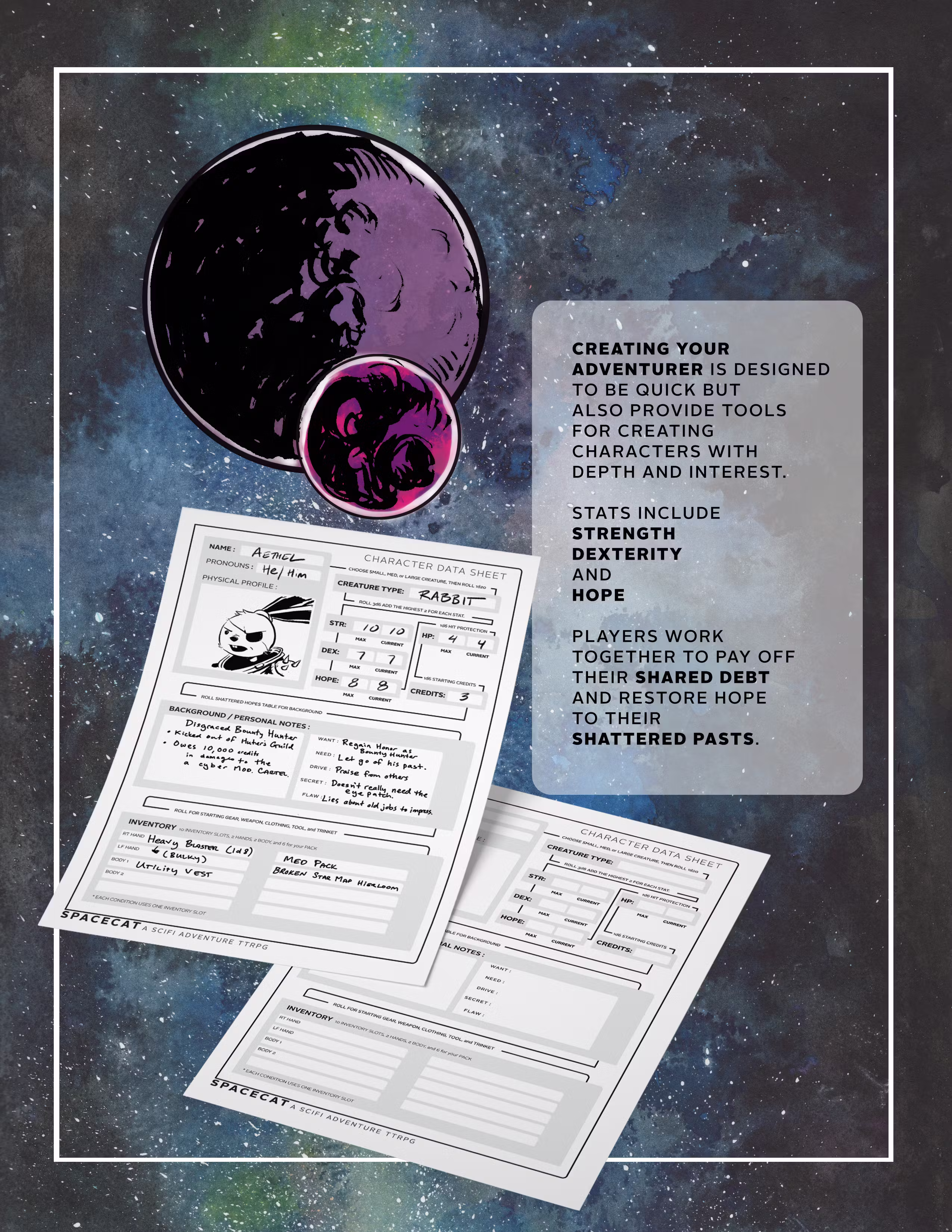 INCLUDES: The 26+ page "SpaceCat Adventures" TTRPG core book Physical and PDF version
