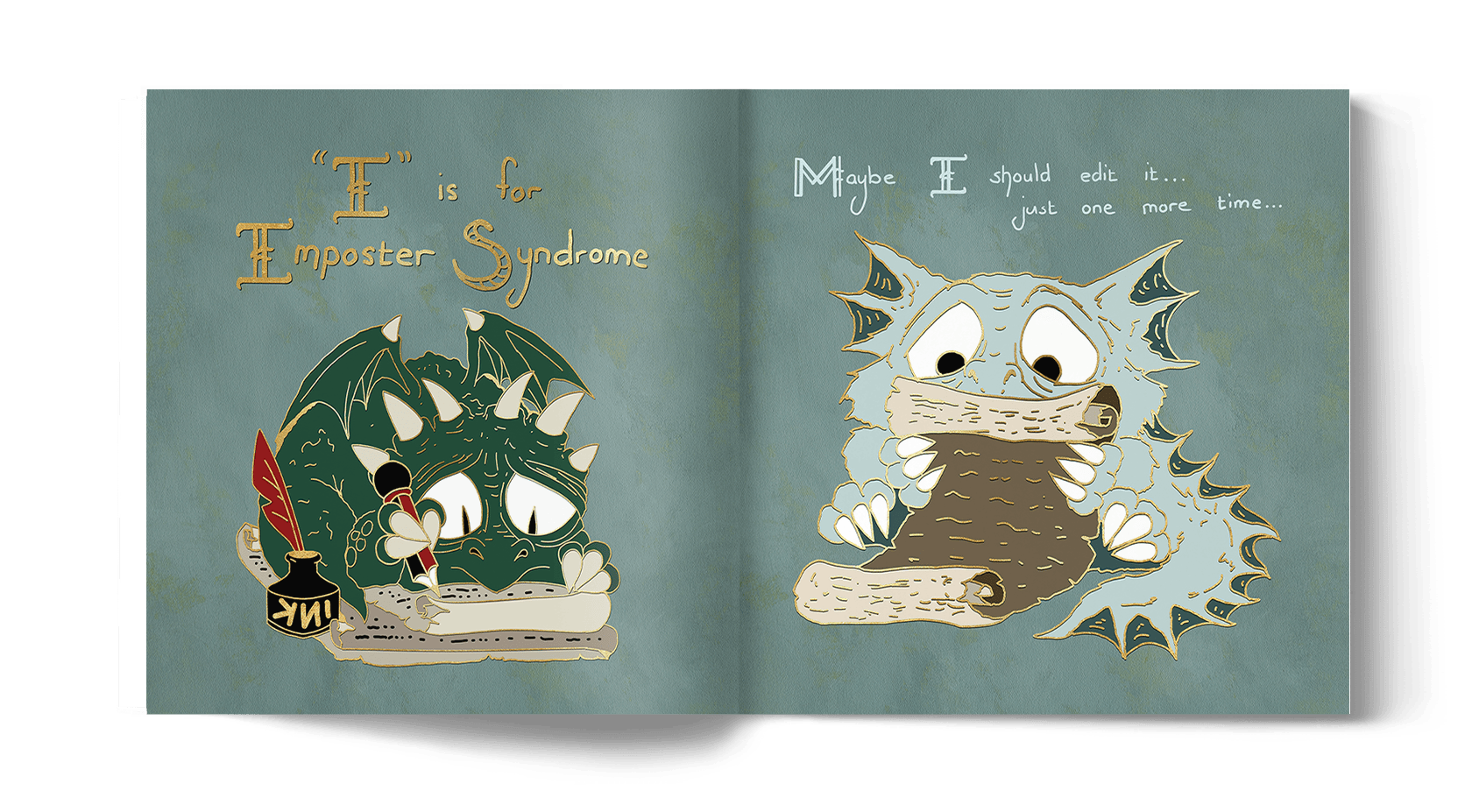 "D is for Derpies" art book! The art book (and pins) features unhinged and adorable, lovable derpy dragons. It's a derailed ABC art book for adults. Why an ABC book? Because as a parent I was tired of A is for Apples. And what better way to prepare our children for adulting than through an ABC book featuring adult humor and words! (Or perhaps I just needed something cute to relate to as an adult myself now that my children have outgrown bedtime stories!)