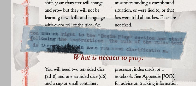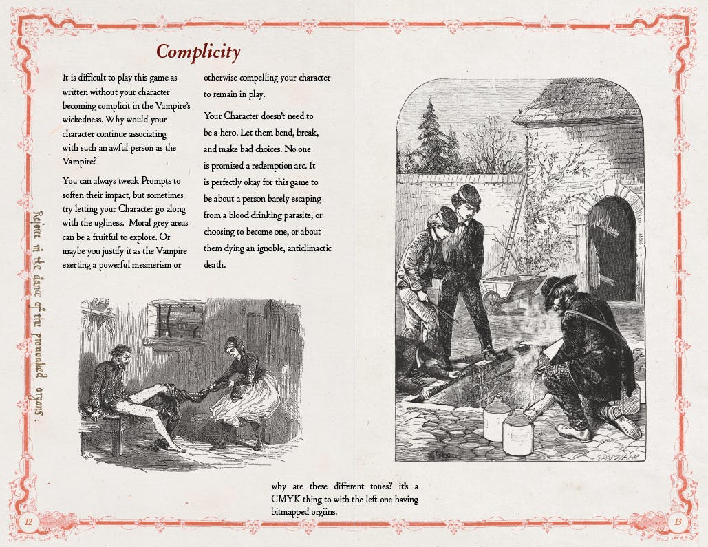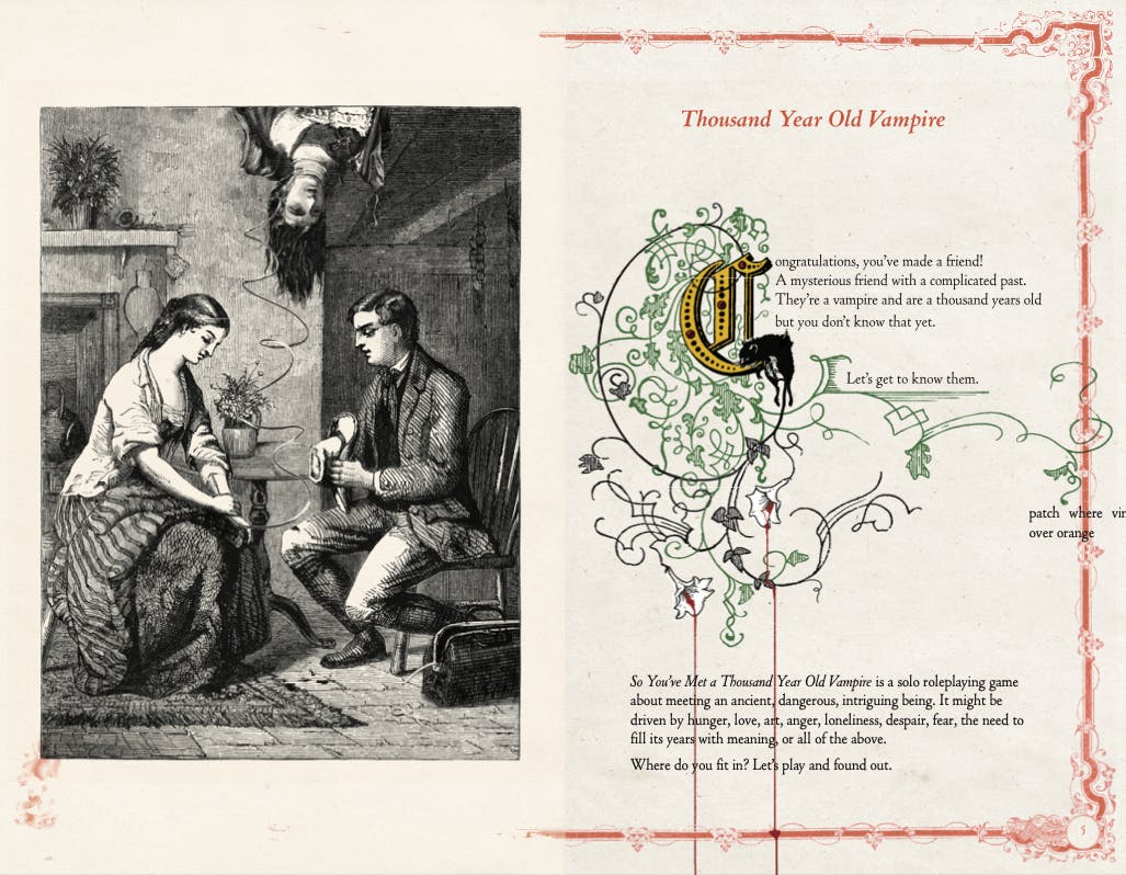 ITEM 1: UPDATERYAll is well. All is really good, actually. I mean, not all-all. There are all sorts of horrible things happening in the world–Kansas, religious end-times hysteria being ginned up in the US military, all sorts of terribleness that is all the more terrible because it is unnecessary. That falls outside the scope of my ‘all’. You can measure the ‘all’ I’m referring to above as whatever is within arm’s reach of me, or that I can wrap my arms around. It is a small, incredibly selfish allness I speak of, and it is doomed to failure because I shall eventually sicken in increments and die. “I am good” will become greasier, sliding from “I am pleased with my productivity and am somewhat happy” to “Today I am not experiencing as much pain as usual” and onward.Fuck. I started out to share good news and just look at me. I just wrote “Okay, okay, okay” which in itself rattled my personal sense of wellness. It was what I used to say to the class when we were on an interesting topic that had diverged too far from where we needed to be. It used to be how I signaled that we needed to refocus our thinking and now it just reminds me that I miss teaching.So let’s not talk about allness and wellness but just focus on the business we really care about. Here’s the opening page spread of So You’ve Met A Thousand Year Old Vampire. It ain't finished but it is finished enough to share. You might consider it a “proof of life” showing that the book is underway but it could just as easily be an ear sent in the mail–no indication at all that anything is alive but just that I had the body at some point. (Holy shit, I’m really in a mood.)I’m proud of the opening page spread. The opening “drop cap” was a real problem. As you can see I am following TYOV’s look because, duh, that makes sense in a sister book. TYOV’s intro paragraph started with an awesome bleeding letter T. Behind the T is a child being harassed by a vulture. Perfect. Too perfect–I couldn’t figure out how to make anything that measured up to it. I couldn’t even figure out what sources I cobbled that handsome T out of it. Stupid shit like this sticks with me and the solution, like with shit, is to let it heap up and slowly turn to rich dirt. That takes time, though. There have been a hundred little composting-style hang-ups slowing up this book and I’ve been blazing my way through them over the past month or so. It’s been great and allowed me the attempt at the “All is well” up above. But yeah, I’m super happy with the floral letter C drop cap. Here’s an early version so you can see what I started with:(That is a big letter C graphic. Shopify changed the layout tools and I can't figure out how to make it smaller without going all the way back to my desktop.)Anyways, I dug this C out of a book or some old magazine. Can't remember. The mouse came from a fancy title calligraphy thing I did for a Chinese translation of TYOV, I dunno if they are going to use it or not but I am using the mouse here, too. It's my shrike-impaled mouse, I can do what I like with it.From there the drop cap grew organically. I had no plan but followed the logic of what was offered. The mouse's tail grew into a parallel set of floral decorations. The mouse-flowers pour blood in a manner that echoes the bleeding drop cap in TYOV. Perfect. Then I was all like "Oh hey, let's have the vines wander all the way over the page" and then I was reducing and modifying the introductory text to fit around the dropcap noise and this is exactly not how you efficiently make a book. Nonetheless, I was enjoying the making.This is not an efficient process. I bet I spent eight hours total on drop cap fuckery. And I'm sure I'll go back to it. There's room for more floralness in there. I'll both reward myself with making-vine-time and put it on my 'wheel spinning and do not know what to do' list.An old student of mine wrote me with a question about defining 'art games' and, in my response, I couldn't help but talk about my own game making in relation to the definitions I was offering.After offering up an over-wide definition of art games as "A game that uses or addresses critical tools/methodologies/goals usually associated with more traditional art forms or modes of inquiry" I reflected:This is where I live, I think. I produce idiosyncratic systems that are (ideally) inextricably tied to their subject–this is a late modernist/minimalist art thing. Fold in a little "self-awareness of the artwork and its maker" and we can argue that my games come from a maker whose practice (and self) has been pickled in the "general high culture" brine. Add in some additional stuff like the romantic "solo producer beholden to no one, making what they make uncaring of commercial success" and "experimentation and novelty over refinement of existing methods" and the art game label gets labelier.The above is extracted from a personal email so forgive its lack of rigor and cohesiveness.I'm sharing this because of the "solo producer beholden to no one" line. Because of the SYMA Kickstarter that isn't true. I'm working for all of you folks. None of you are giving me specific instructions on how to do my work but I owe you a thing that meets certain criteria. The "idiosyncratic systems" line refers both to what I've made and to how I make it, and my stupid "I will spend eight hours on the drop cap and will allow myself more time on it as a treat" is part of that. Idiosyncratic methods don't align well with deadlines.There's not really a solution to this that doesn't detract from the outcomes for everyone involved. Going forward I'm not going to do a Kickstarter until I have files ready for the printer. It is an easy, obvious solution that's good for everyone. In the meantime I will be idiosyncraticing away at highest possible speed and avoiding the miseries that will distract me from my appointed tasks.I'm expecting you'll get the SYMA books th