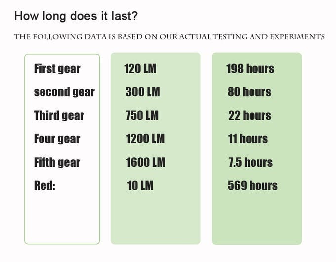 NLOKER's brightness can reach 1600LM (real laboratory test data, not similar products like to false label) and has 5-level brightness adjustment function, first level brightness: 120lm, second level brightness: 300lm, third level brightness: 750lm, fourth level brightness: 1200lm, fifth level brightness: 1600lm