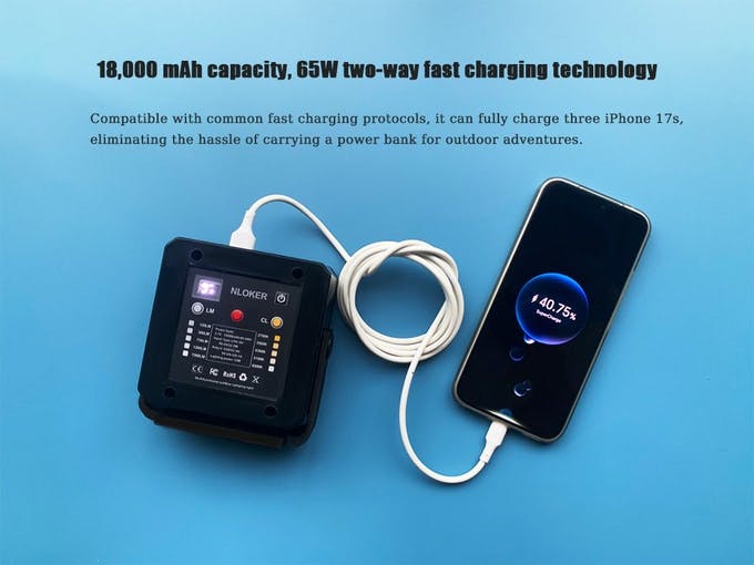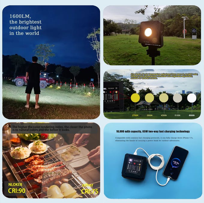 Therefore, we have designed such a product based on the actual needs of outdoor camping and adventure use. The brightness of NLOKER can reach up to 1600LM (laboratory measured data), the color temperature is adjustable in five levels from 2500K-6500K, and the color rendering index can reach 87. In particular, the battery life is long, with a maximum of 258 hours, or 10 days. It can also power other devices such as mobile phones and drones. When fully charged, it can fully charge 3 iPhones, solving the problem of insufficient mobile phone power.