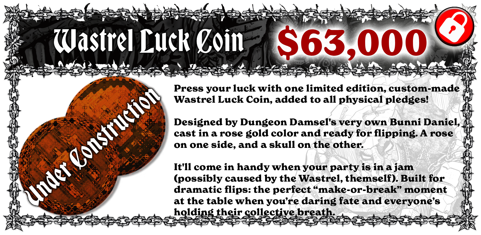 If we hit $63,000, every physical backer will receive a limited edition Wastrel Luck Coin, custom designed by Dungeon Damsel’s Bunni Daniel (our incredible collaborators over at Druskara ).