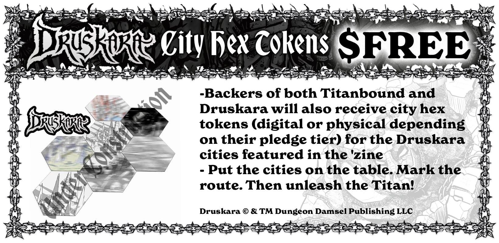 And there’s more: backers of both campaigns will also receive city hex tokens for the Druskara cities featured in the zine - perfect for dropping directly onto your overland maps.