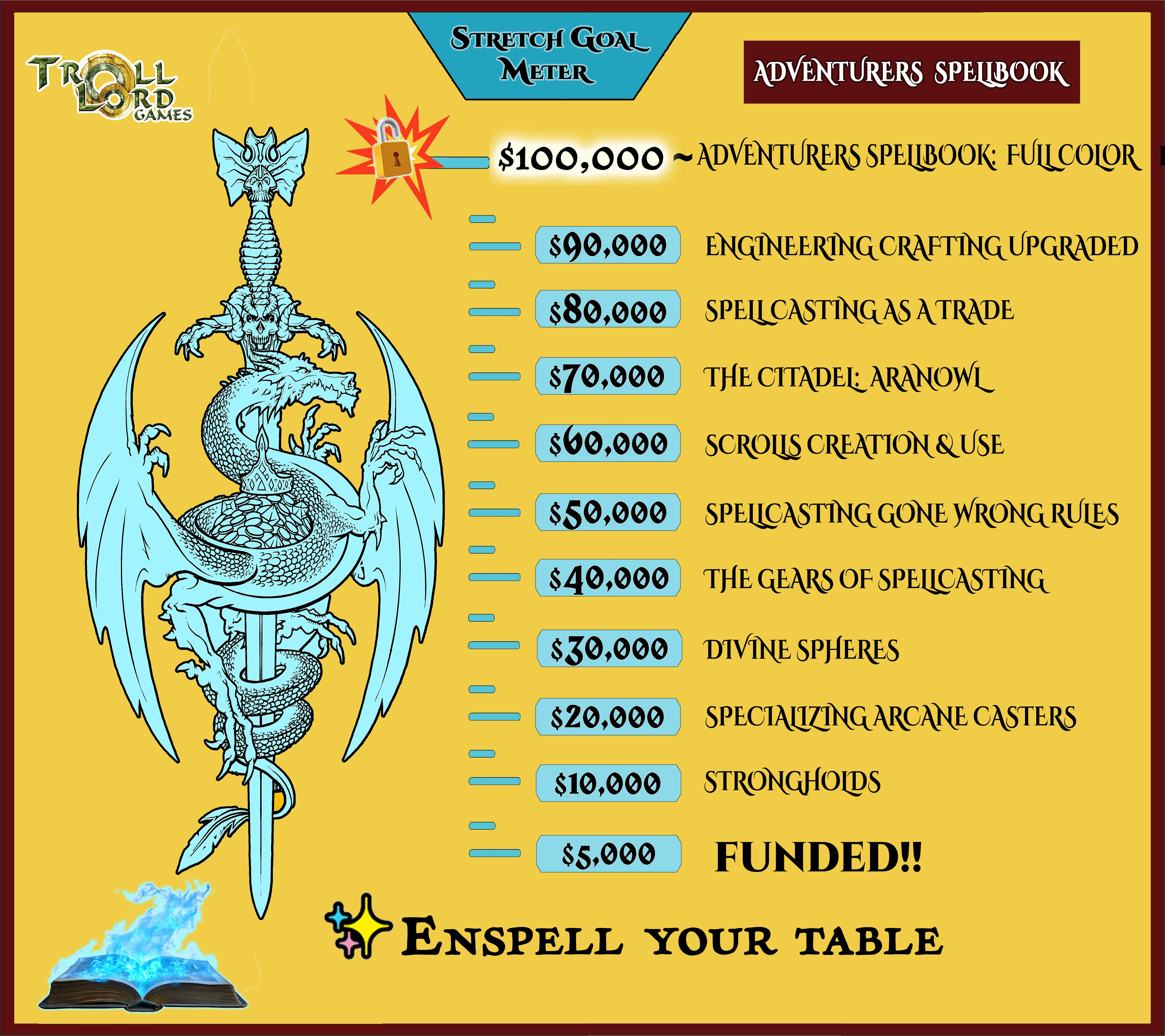 ✨ $80,000 || Spell Casting as a Trade Guidelines: Spell use is common. We all use it, we all need it. But what happens when you have to hire it done. We’ll expound on the rules set out in the CKG, but what’s more, we’ll design rules on hiring your own spellcaster out to NPCs! The Baron of Ludenshiem may just need to hire you to defend his gate. How much is he going to pay? You’ll have it all in Adventurers Spellbook! This stretch reward goes to all backers PDF and Print formats, since it is a content improvement for the Adventurers Spellbook.