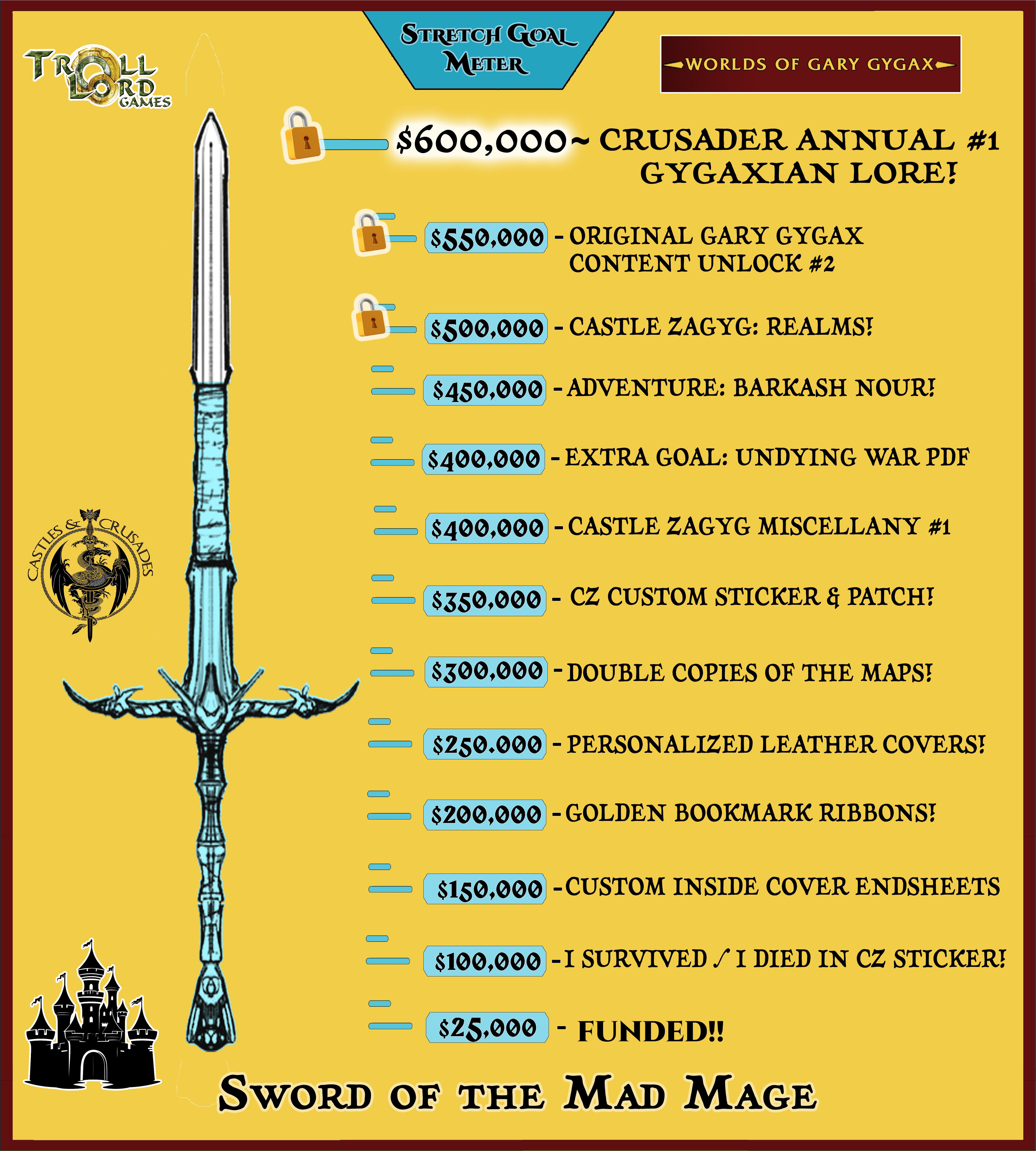 🔒 $600,000 || Crusader Annual #1: Gygaxian Lore! A special edition of the Crusader joins the family! Here we’ll include the history of Castle Zagyg, from the Greyhawk notes to Zagyg! We’ll lean heavily on those who helped write it, what we remember from personal conversations and emails with Gary Gygax and of course, his notes. This issue also includes: How it all Happened by Gary Gygax (compiled from early issues), an interview with the indomitable Luke Gygax, The art of Castle Zagyg, an adventure and more! Roughly 50 pages of content. The $54. $99 and $135 pledge levels receive a PDF version, the $140, 300 and $380 pledge levels receive both PDF and Print versions.