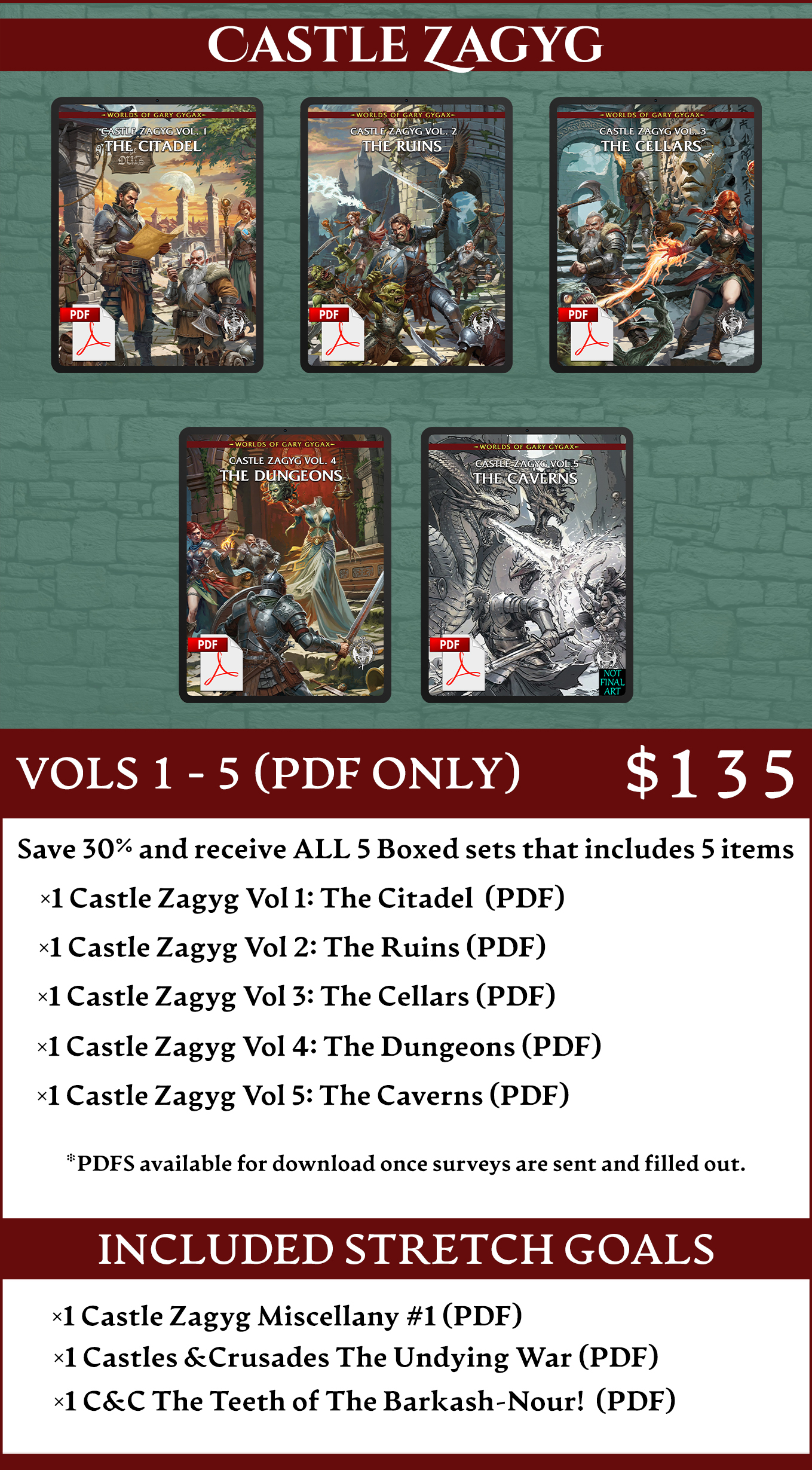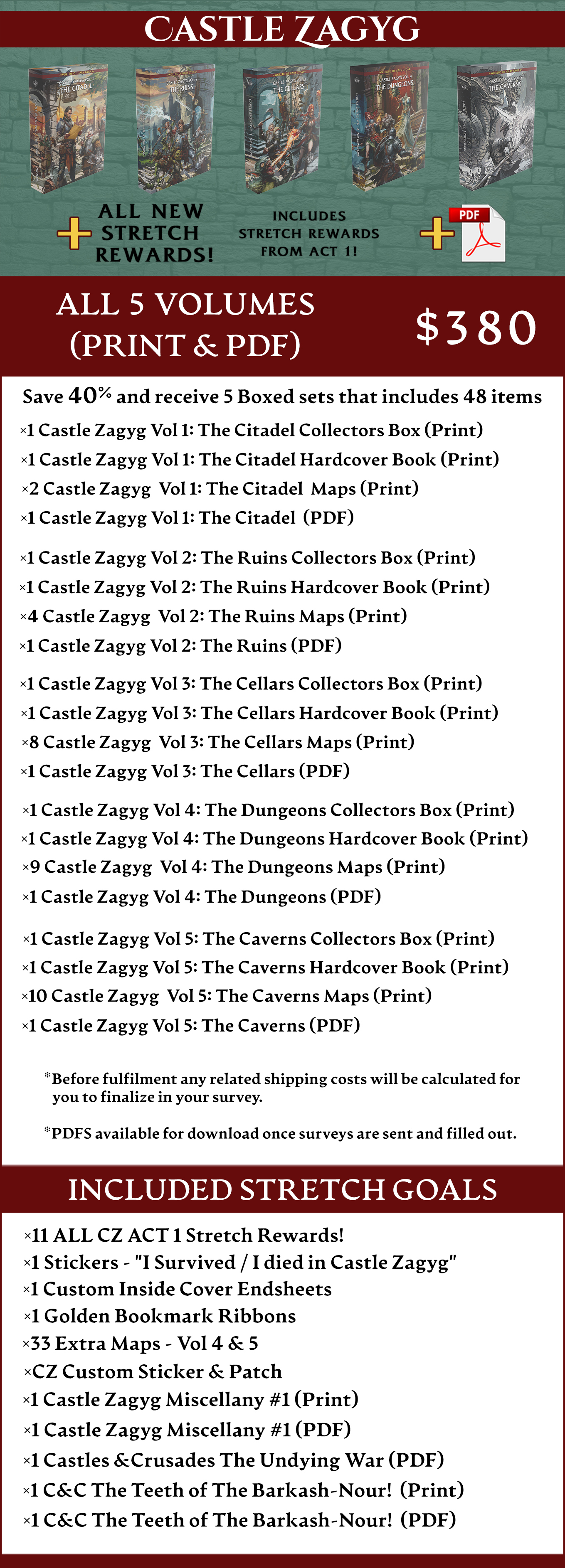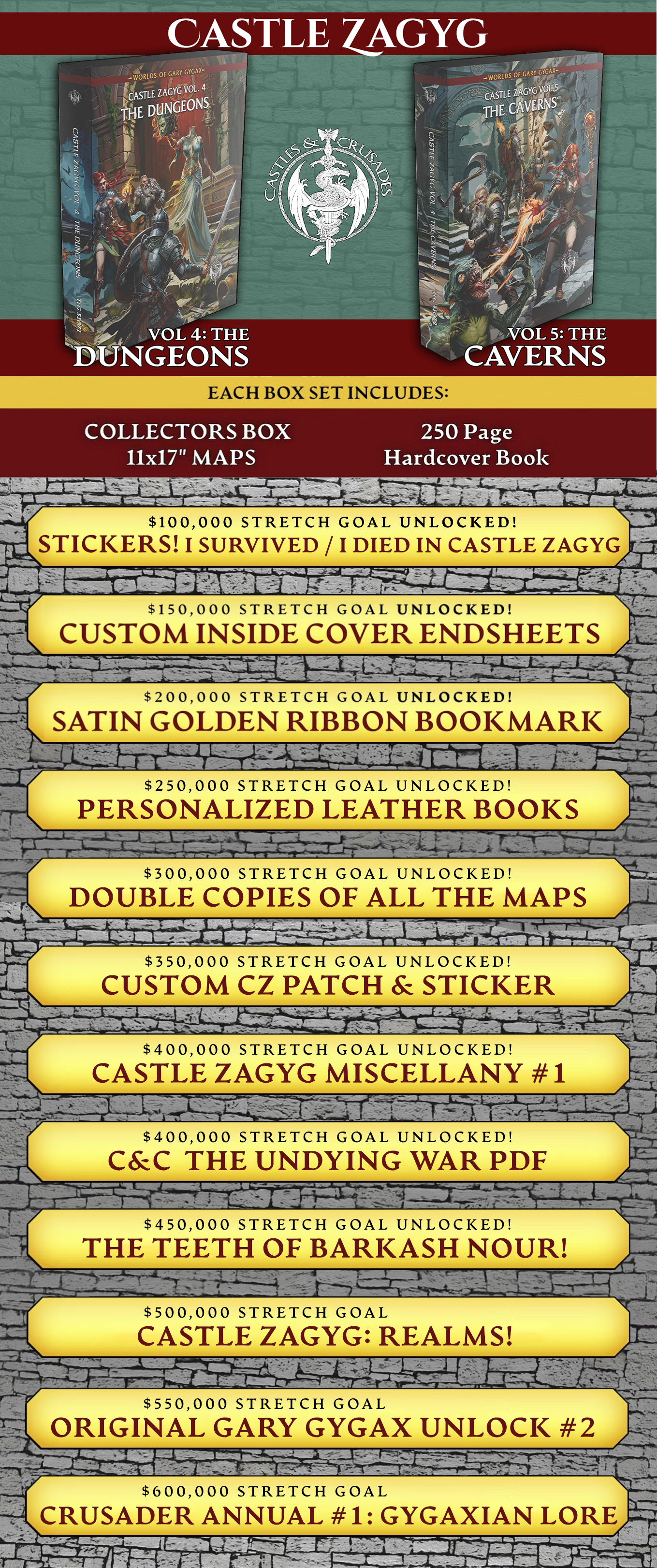 With your help, we are halfway through our efforts to bring to shelves worldwide Gary Gygax's Castle Zagyg in all of its glory. It is a monstrous project; one with an incredible legacy! Our goal is to see all the material in Castle Zagyg released in 5 full color, hardcover volumes, each in its own box with relevant game maps. Castle Zagyg is written and designed to be played with Castles & Crusades.