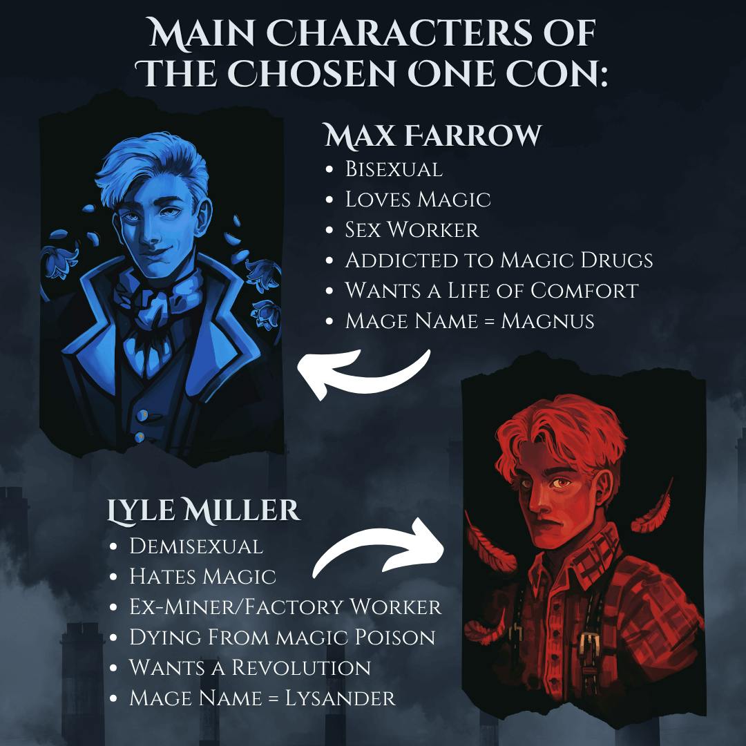 The Chosen One Con is the first book in the Lost in the Aether duology—an upcoming queer MM gaslamp fantasy of industrial magic in a world of designer enchantments and celebrity-branded potions. This is an adult book containing strong language and mature themes that some readers may find disturbing, as well as content considered rude and crude. View the full list of content warnings or check the FAQ for more details.