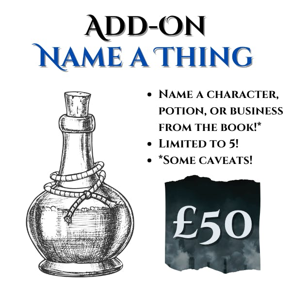 This is your chance to make your mark on The Chosen One Con! As the book is still in development, I'm offering backers the chance to name a character, branded potion, or magical business that will appear in the book, limited to 5 backers. The caveat is that these names must fit within the world of the book. Inappropriate names will be vetoed, but we'll work together to come up with a name we'll both like!