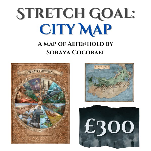 My first stretch goal is for a City Map of Aefenhold as designed by the wonderful Soraya Cocoran. Soraya has designed maps for my books previously, including the incredible Domain Crossings map from The Cruel Gods series. If unlocked, a black and white version of the city map will appear in the eBook and paperback copies of The Chosen One Con. A colour copy of the city map will be available as a digital and print reward for the Blue Mage Licence tier and as an add-on.
