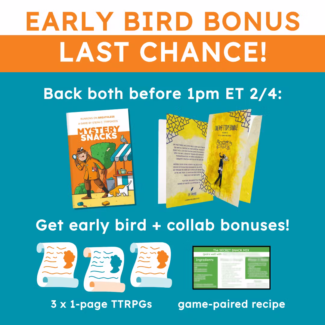 If youback both Mystery Snacks AND our partner project, One Page TTRPG Bundle Vol 2, at at least the $1 teir before the early bird bonuses run out, you will get the following extras: