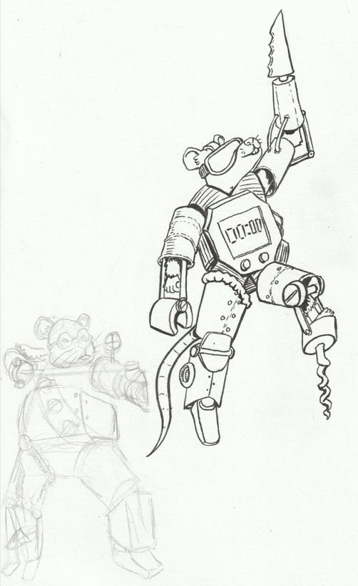 At the same time, I tried to be really careful with the mech designs. I don't know the first thing about engineering, but I wanted to look at them and have some idea of their functionality. Extending the mice limbs seemed important to give a more imposing silhouette, but I didn't want it to feel artificial.
