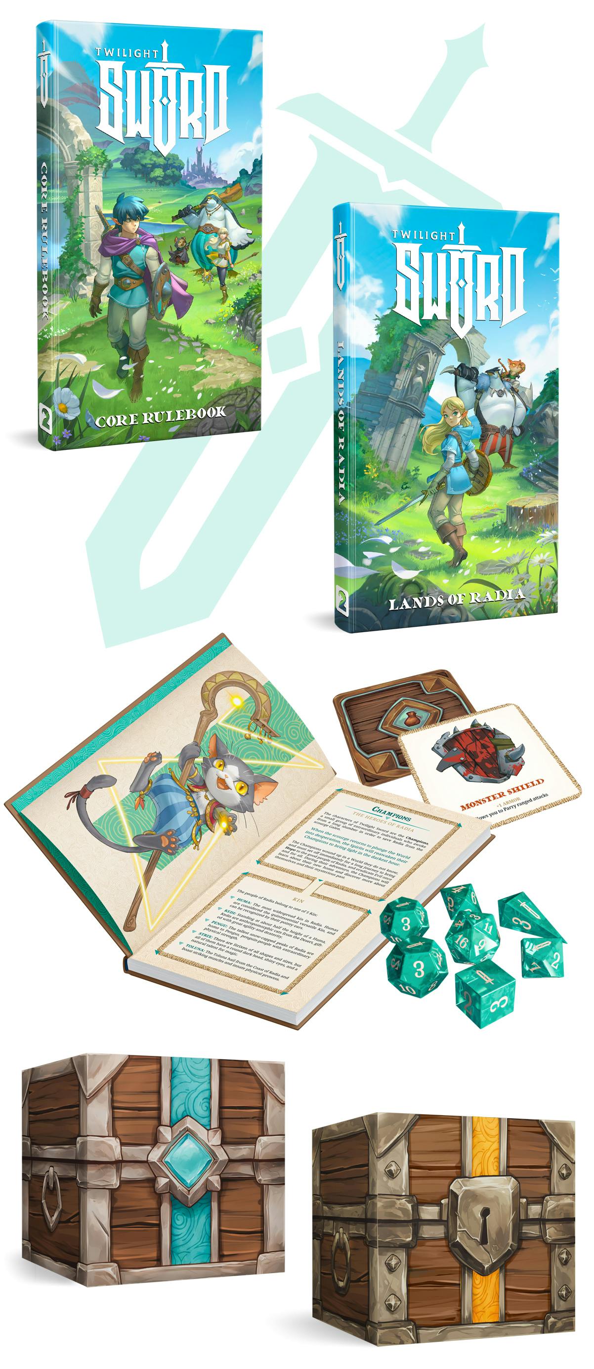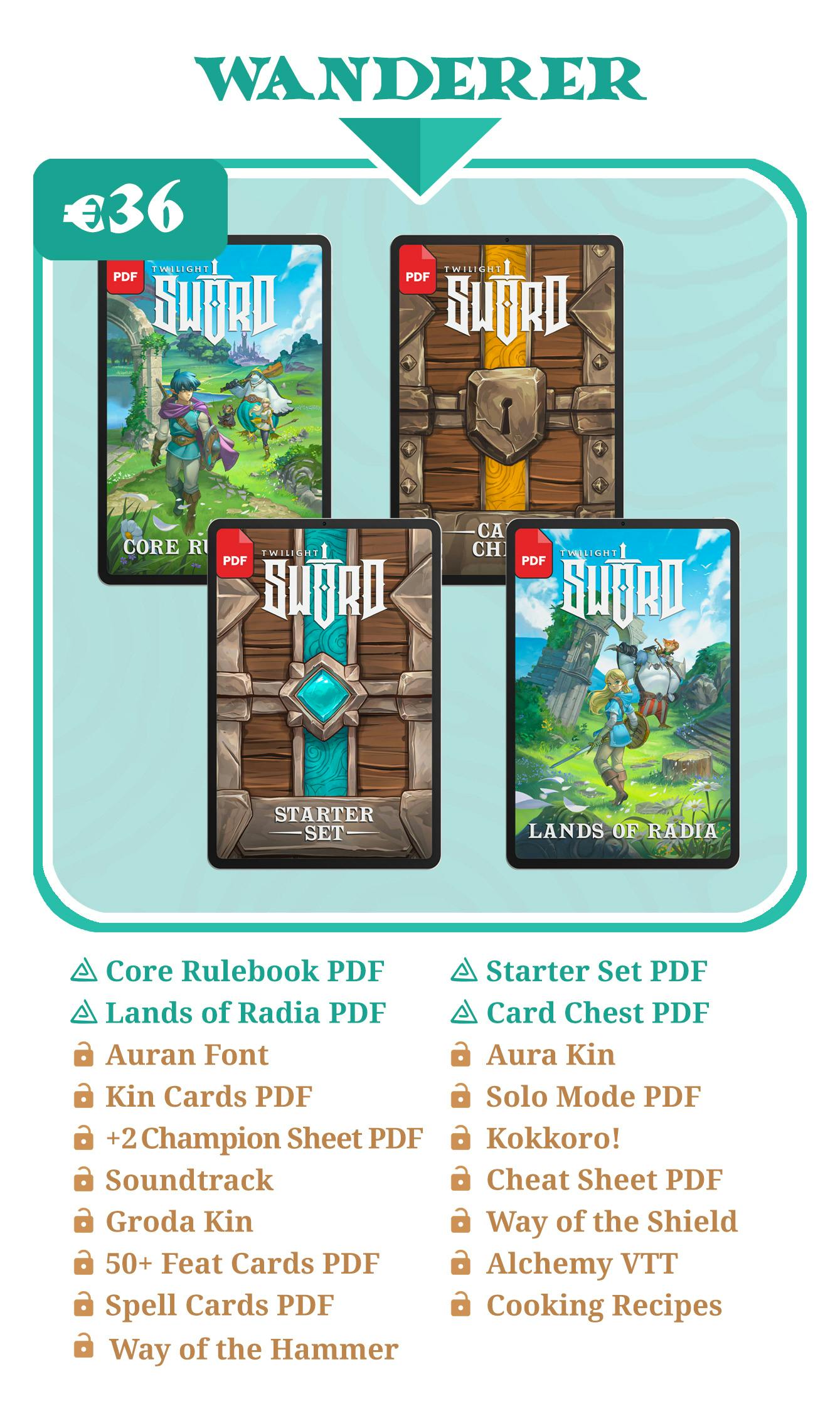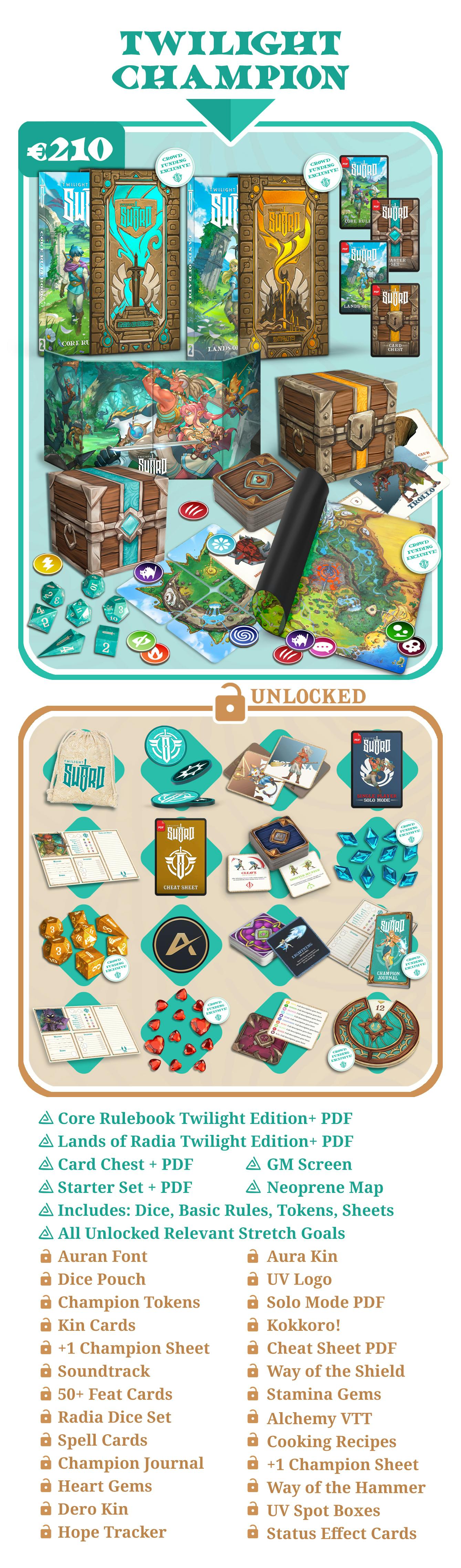 Core Rulebook - Twilight Edition + PDF Lands of Radia - Twilight Edition + PDF Starter Set + PDF Card Chest + PDF GM Screen Neoprene Map UNLOCKED Dice Pouch UNLOCKED +2 Champion Sheet UNLOCKED Champion Tokens UNLOCKED Stamina Gems UNLOCKED Auran Font UNLOCKED Aura Kin UNLOCKED Way of the Shield UNLOCKED Way of the Hammer UNLOCKED Kokkoro! UNLOCKED Cooking Recipes UNLOCKED Soundtrack UNLOCKED UV Logo UNLOCKED Kin Cards UNLOCKED Feat Cards UNLOCKED Spell Cards UNLOCKED Cheat Sheet - PDF UNLOCKED Solo Mode - PDF