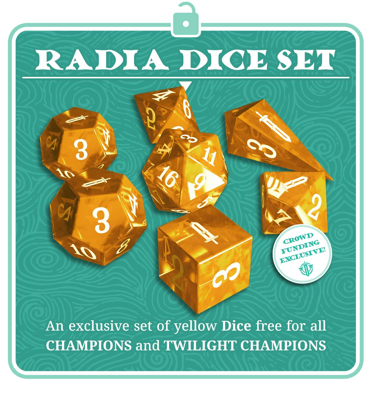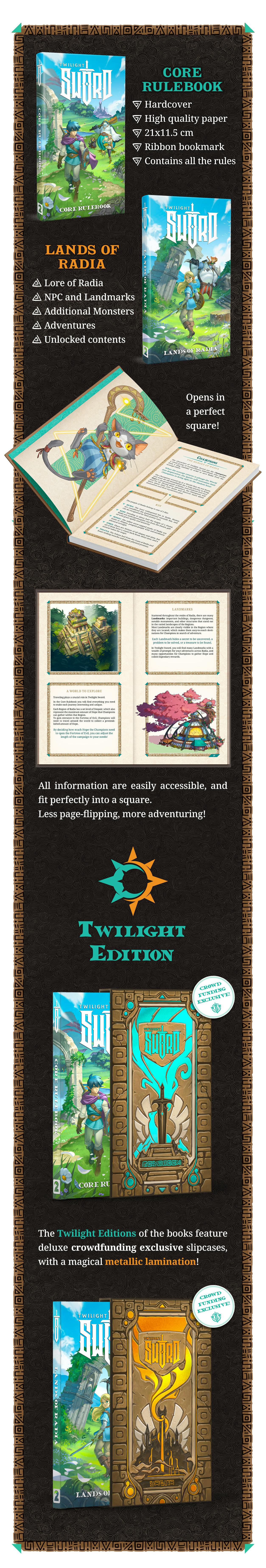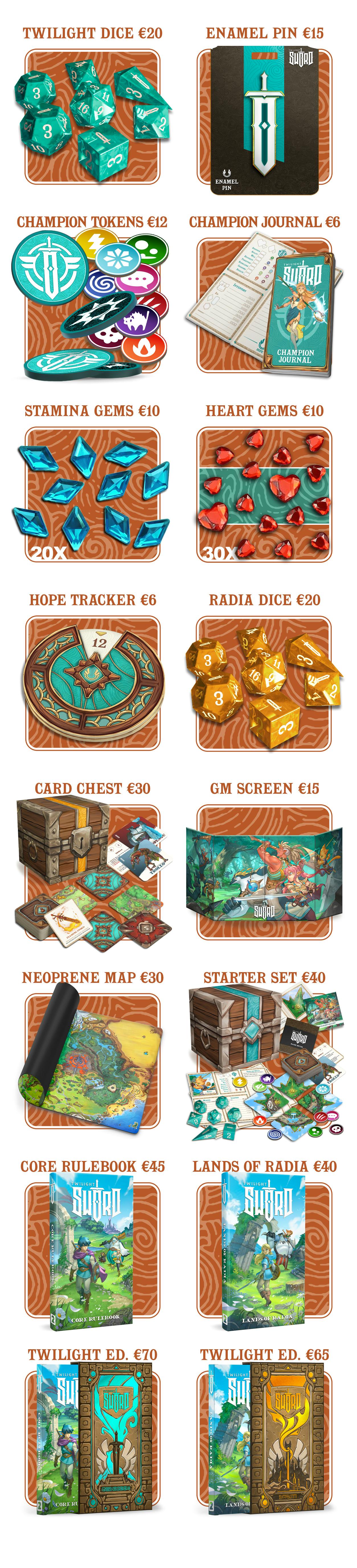 Core Rulebook - Twilight Edition + PDF Lands of Radia - Twilight Edition + PDF Starter Set + PDF Card Chest + PDF GM Screen Neoprene Map UNLOCKED Dice Pouch UNLOCKED +2 Champion Sheet UNLOCKED Champion Tokens UNLOCKED Stamina Gems UNLOCKED Auran Font UNLOCKED Aura Kin UNLOCKED Way of the Shield UNLOCKED Way of the Hammer UNLOCKED Kokkoro! UNLOCKED Cooking Recipes UNLOCKED Soundtrack UNLOCKED UV Logo UNLOCKED Kin Cards UNLOCKED Feat Cards UNLOCKED Spell Cards UNLOCKED Cheat Sheet - PDF UNLOCKED Solo Mode - PDF