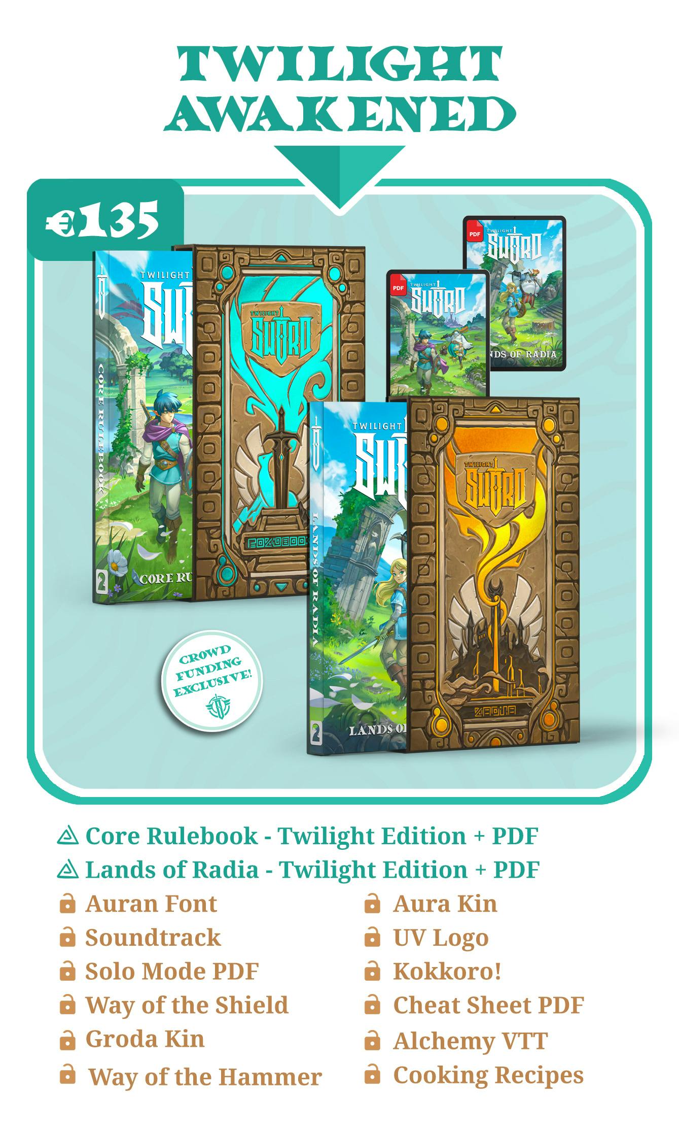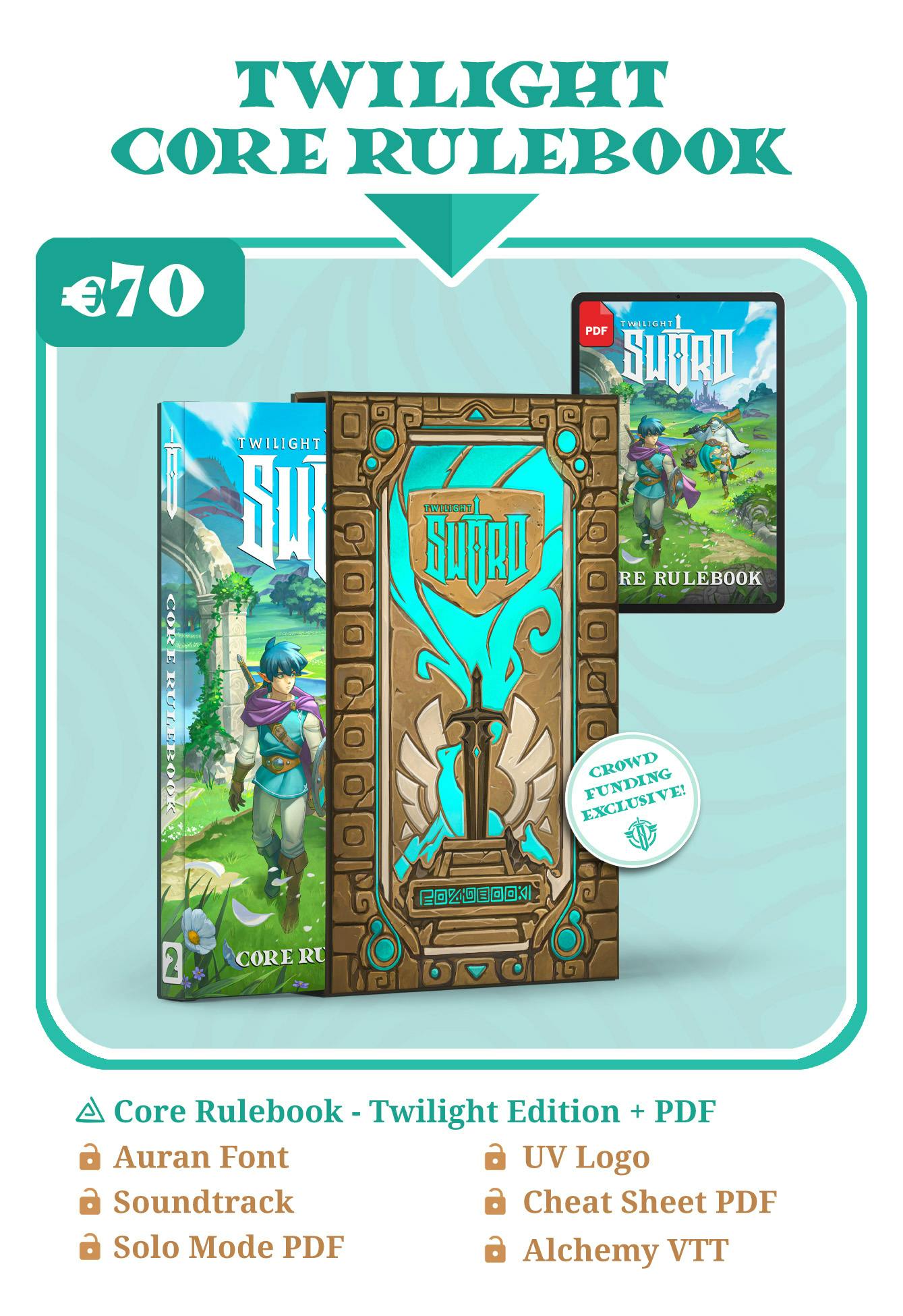 Core Rulebook - Twilight Edition + PDF UNLOCKED Auran Font UNLOCKED UV Logo UNLOCKED Twilight Edition Embossing UNLOCKED Soundtrack UNLOCKED Cheat Sheet - PDF UNLOCKED Solo Mode - PDF UNLOCKED Alchemy VTT