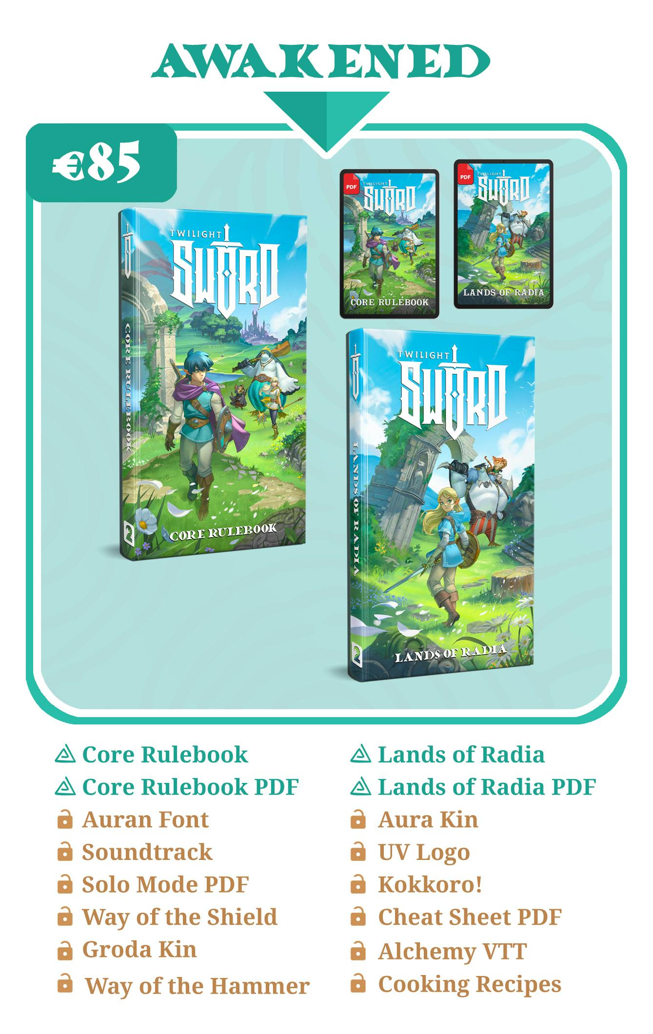 Core Rulebook - Twilight Edition + PDF Lands of Radia - Twilight Edition + PDF UNLOCKED Auran Font UNLOCKED Aura Kin UNLOCKED Groda Kin UNLOCKED Way of the Shield UNLOCKED Way of the Hammer UNLOCKED Kokkoro! UNLOCKED Cooking Recipes UNLOCKED Soundtrack UNLOCKED UV Logo UNLOCKED Twilight Edition Embossing UNLOCKED Cheat Sheet - PDF UNLOCKED Kin Cards - PDF UNLOCKED Solo Mode - PDF UNLOCKED Alchemy VTT