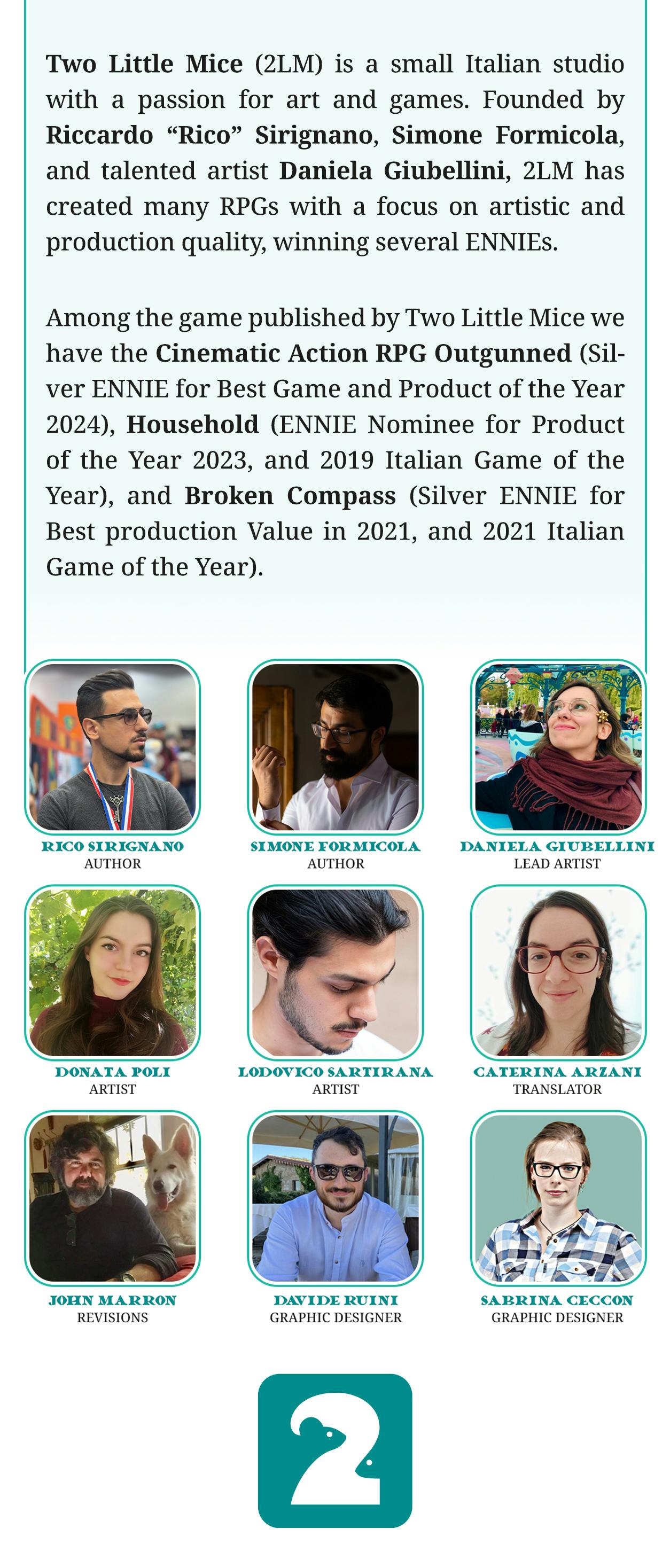 Two Little Mice (2LM) is a small Italian studio with a passion for art and games. Founded by Riccardo "Rico" Sirignano, Simone Formicola, and talented artist Daniela Giubellini, 2LM has created many RPGs with a focus on artistic and production quality, winning several ENNIEs.