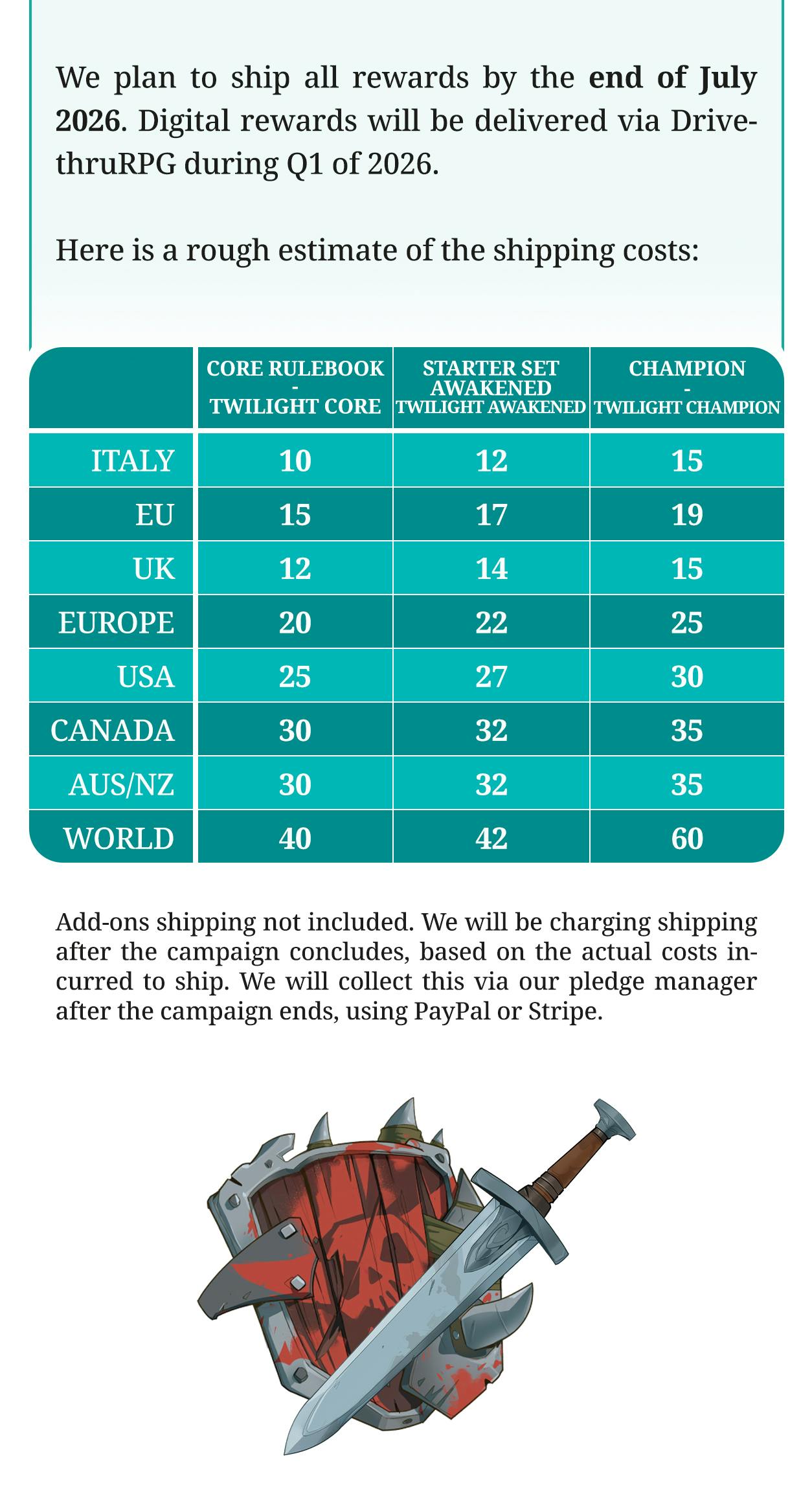 We plan to ship alla rewards by the end of July 2026. Digital rewards will be delivered via DrivethruRPG during Q1 2026.