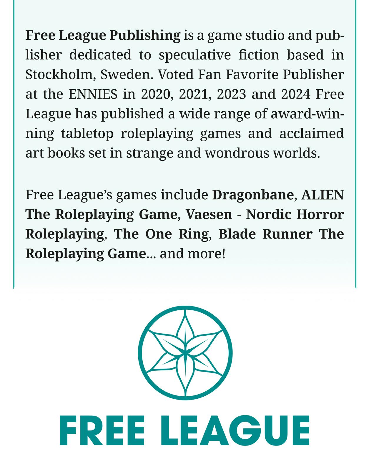Free League Publishing is a game studio and publisher dedicated to speculative fiction based in Stockholm, Sweden. Voted Fan Favorite Publisher at the ENNIES in 2020, 2021, 2023 adn 2024 Free League has published a wide range of award-winning tabletop roleplaying games and acclaimed art books set in strange and wondrous worlds.